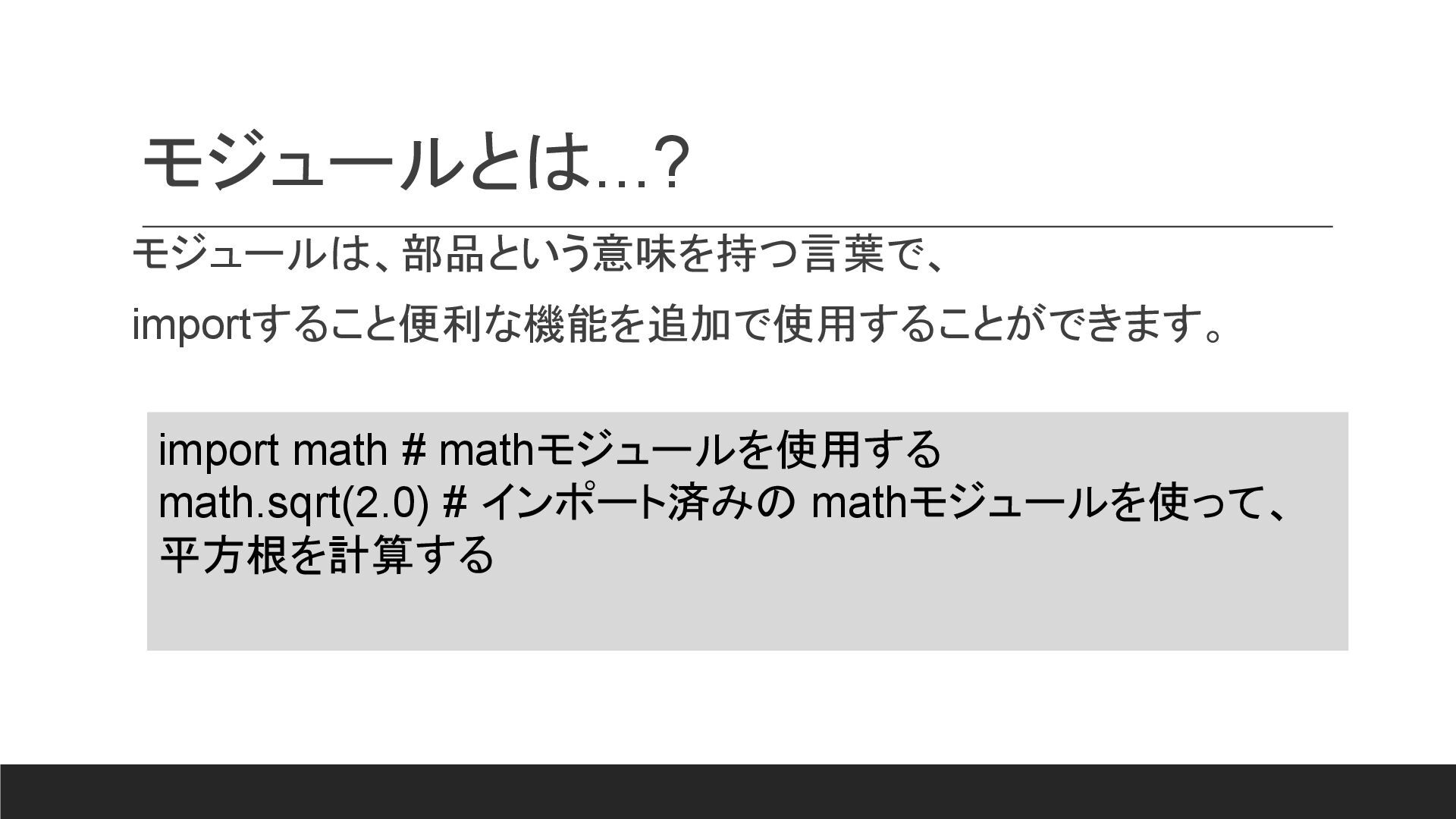 モジュールとは...? モジュールは、部品という意味を持つ言葉で、 importすること便利な機能を追加で使用することができます。 import math # mathモジュールを使用する math.sqrt(2.0) # インポート済みの