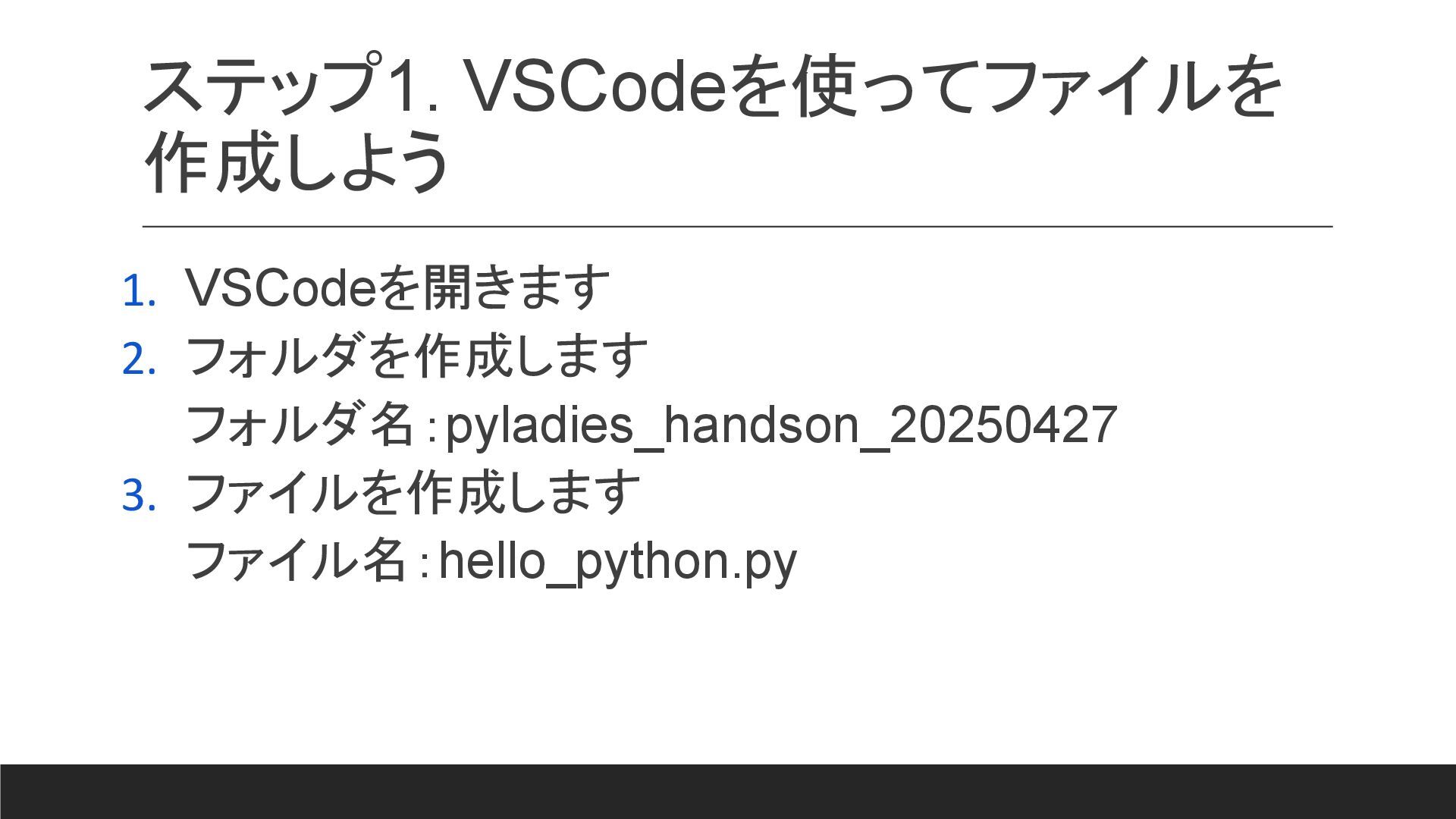 ステップ1. VSCodeを使ってファイルを 作成しよう 1. VSCodeを開きます 2. フォルダを作成します フォルダ名:pyladies_handson_20250427 3. ファイルを作成します