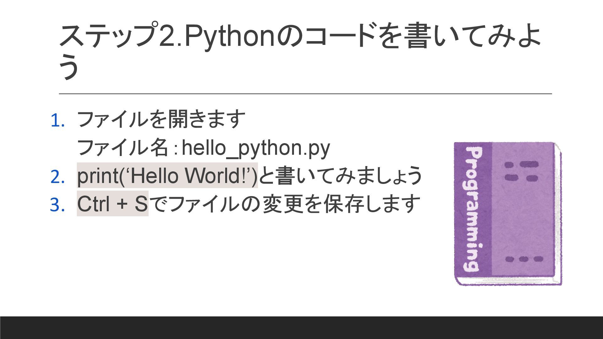 ステップ2.Pythonのコードを書いてみよ う 1. ファイルを開きます ファイル名:hello_python.py 2. print(‘Hello World!’)と書いてみましょう 3. Ctrl