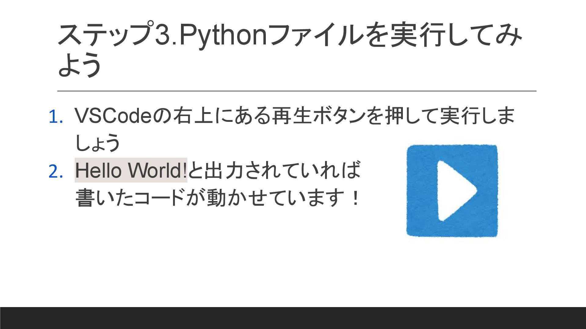 ステップ3.Pythonファイルを実行してみ よう 1. VSCodeの右上にある再生ボタンを押して実行しま しょう 2. Hello World!と出力されていれば 書いたコードが動かせています!