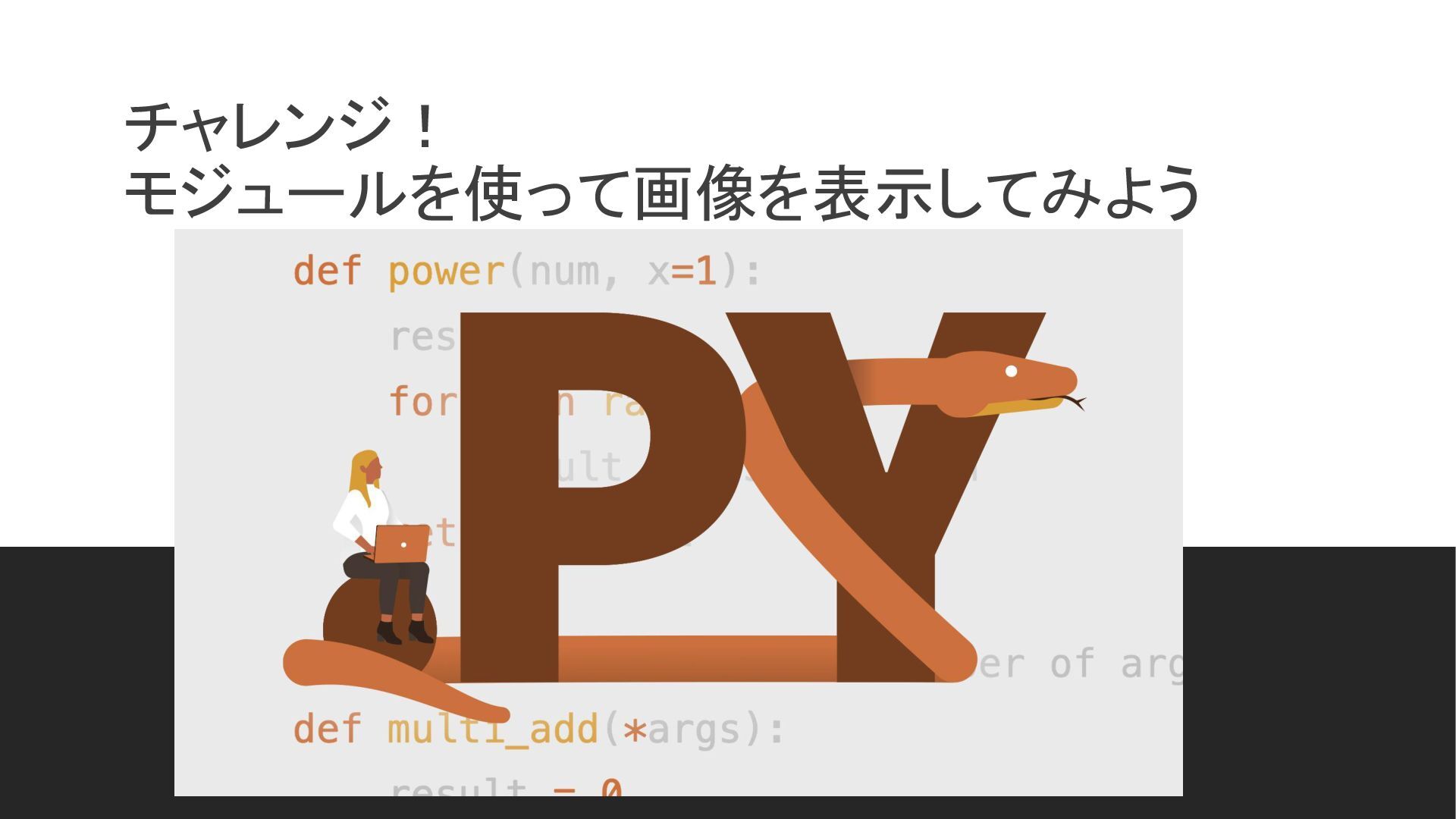 Pythonの文法 • Pythonの関数 • Pythonのモジュール • VSCodeでPythonコードを動かしてみよう • モジュールを使って画像を表示してみよう • モジュールを使って自分が生後何日か計算してみよう
