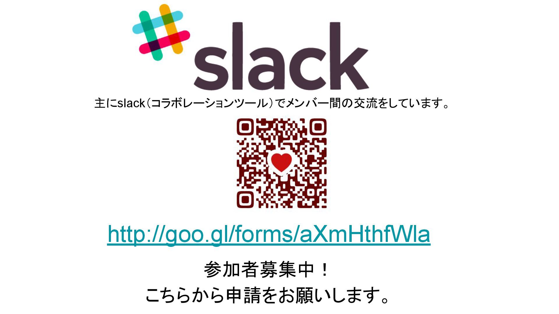 http://goo.gl/forms/aXmHthfWla 参加者募集中! こちらから申請をお願いします。 主にslack(コラボレーションツール)でメンバー間の交流をしています。