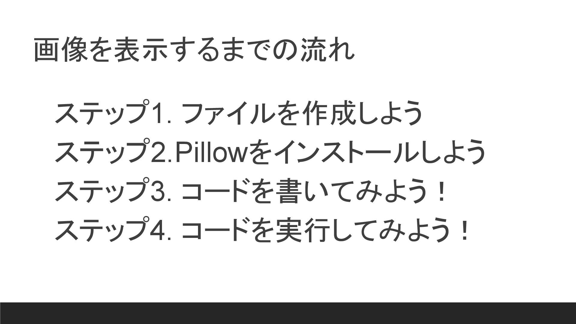 画像を表示するまでの流れ ステップ1. ファイルを作成しよう ステップ2.Pillowをインストールしよう ステップ3. コードを書いてみよう! ステップ4. コードを実行してみよう!