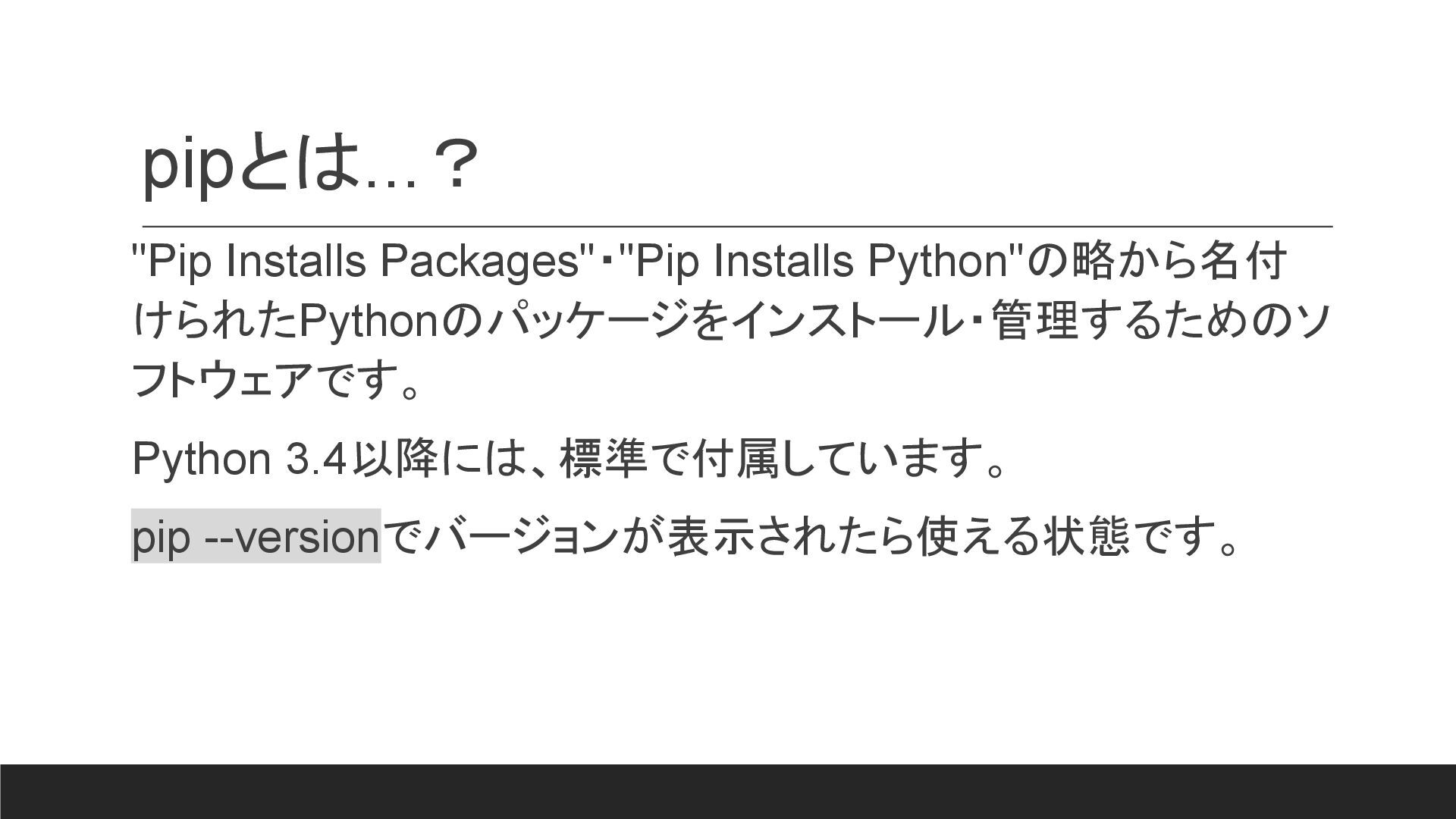 pipとは...? "Pip Installs Packages"・"Pip Installs Python"の略から名付 けられたPythonのパッケージをインストール・管理するためのソ フトウェアです。 Python 3.4以降には、標準で付属しています。
