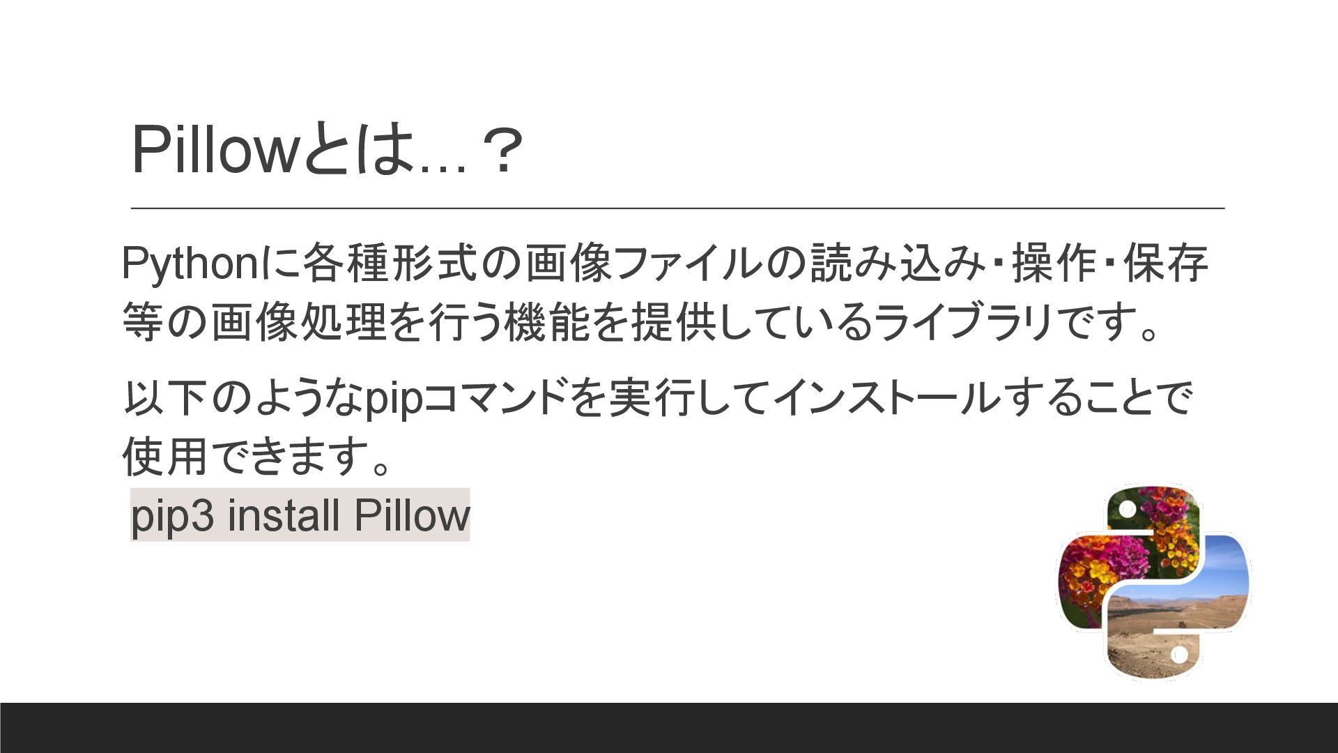 Pillowとは...? Pythonに各種形式の画像ファイルの読み込み・操作・保存 等の画像処理を行う機能を提供しているライブラリです。 以下のようなpipコマンドを実行してインストールすることで 使用できます。 pip3 install Pillow