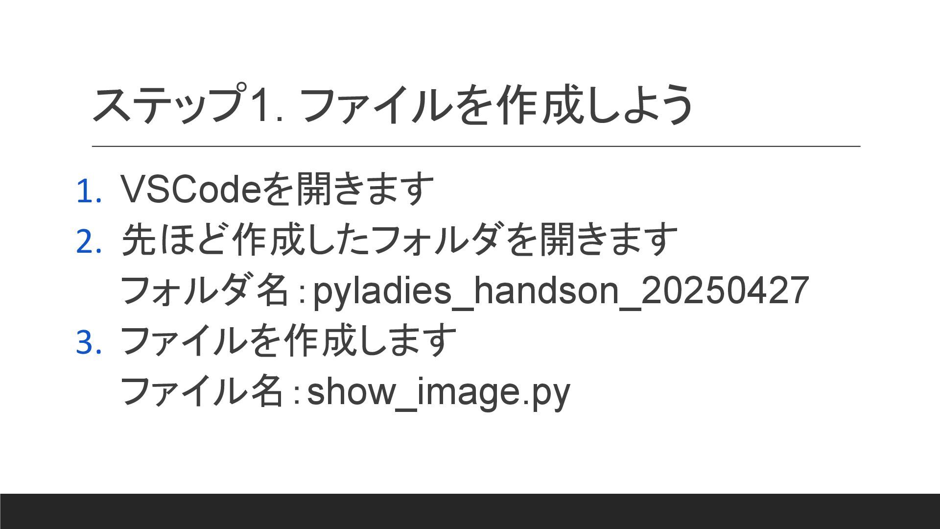 ステップ1. ファイルを作成しよう 1. VSCodeを開きます 2. 先ほど作成したフォルダを開きます フォルダ名:pyladies_handson_20250427 3. ファイルを作成します ファイル名:show_image.py