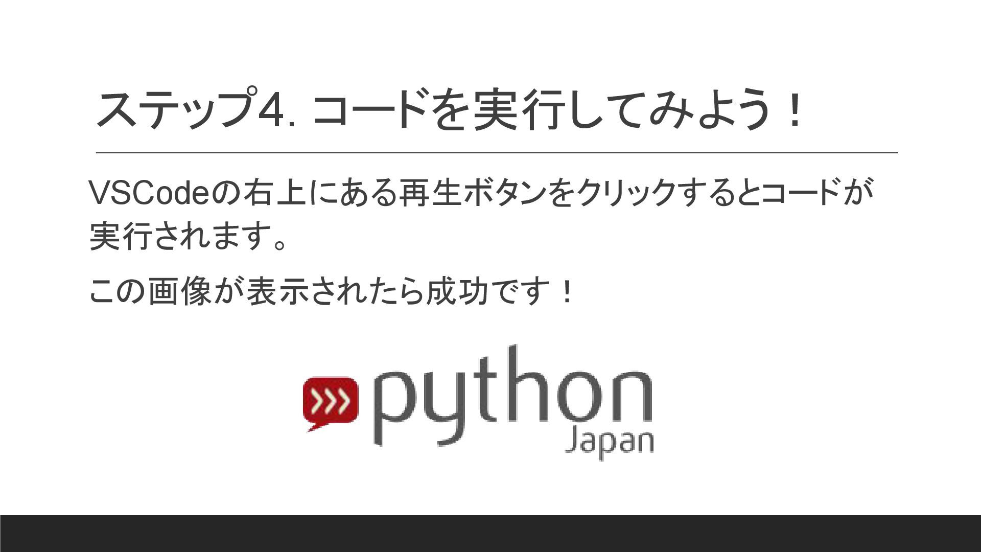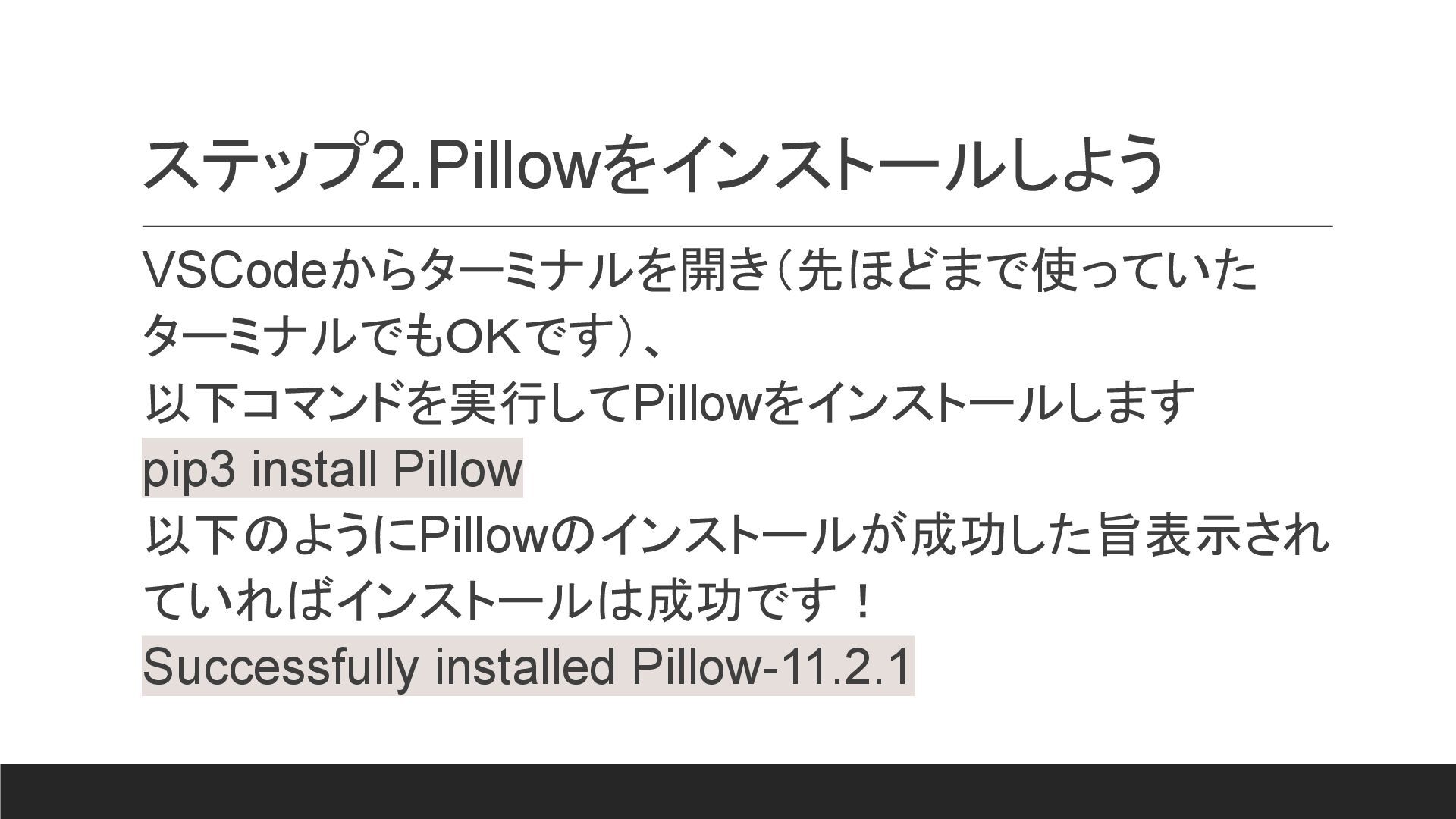 ステップ2.Pillowをインストールしよう VSCodeからターミナルを開き(先ほどまで使っていた ターミナルでもOKです)、 以下コマンドを実行してPillowをインストールします pip3 install Pillow 以下のようにPillowのインストールが成功した旨表示され ていればインストールは成功です! Successfully