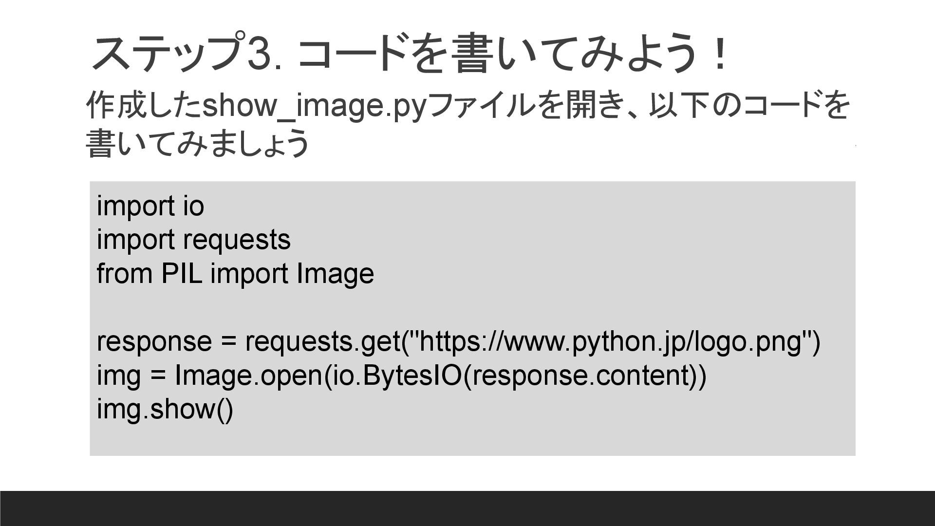 ステップ3. コードを書いてみよう! 作成したshow_image.pyファイルを開き、以下のコードを 書いてみましょう import io import requests from PIL