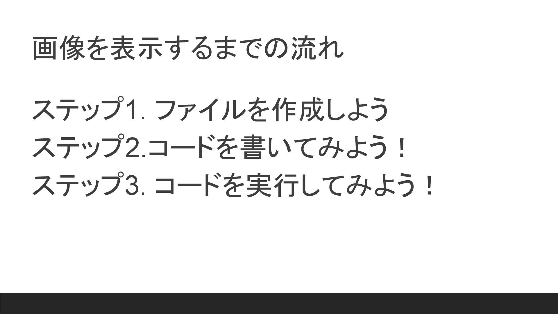 画像を表示するまでの流れ ステップ1. ファイルを作成しよう ステップ2.コードを書いてみよう! ステップ3. コードを実行してみよう!