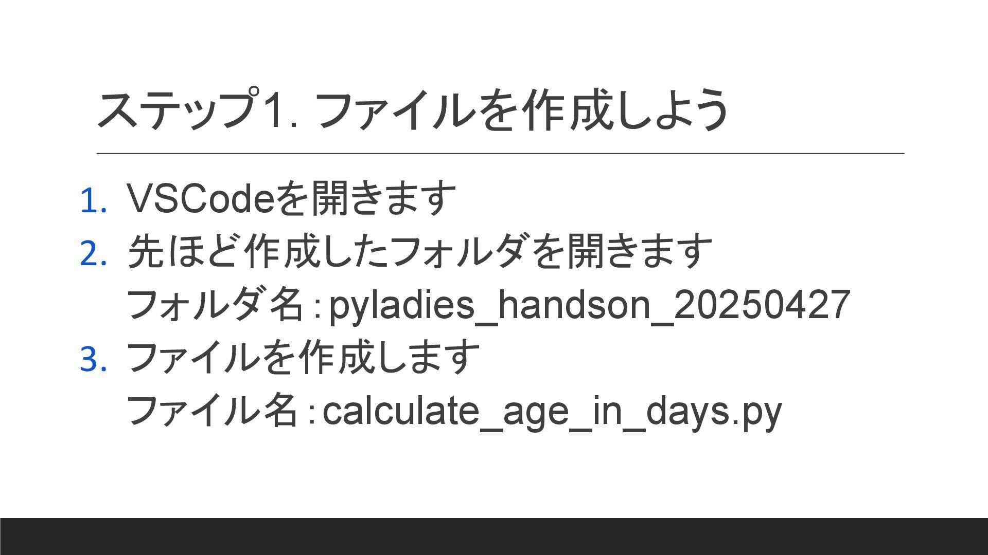 ステップ1. ファイルを作成しよう 1. VSCodeを開きます 2. 先ほど作成したフォルダを開きます フォルダ名:pyladies_handson_20250427 3. ファイルを作成します ファイル名:calculate_age_in_days.py