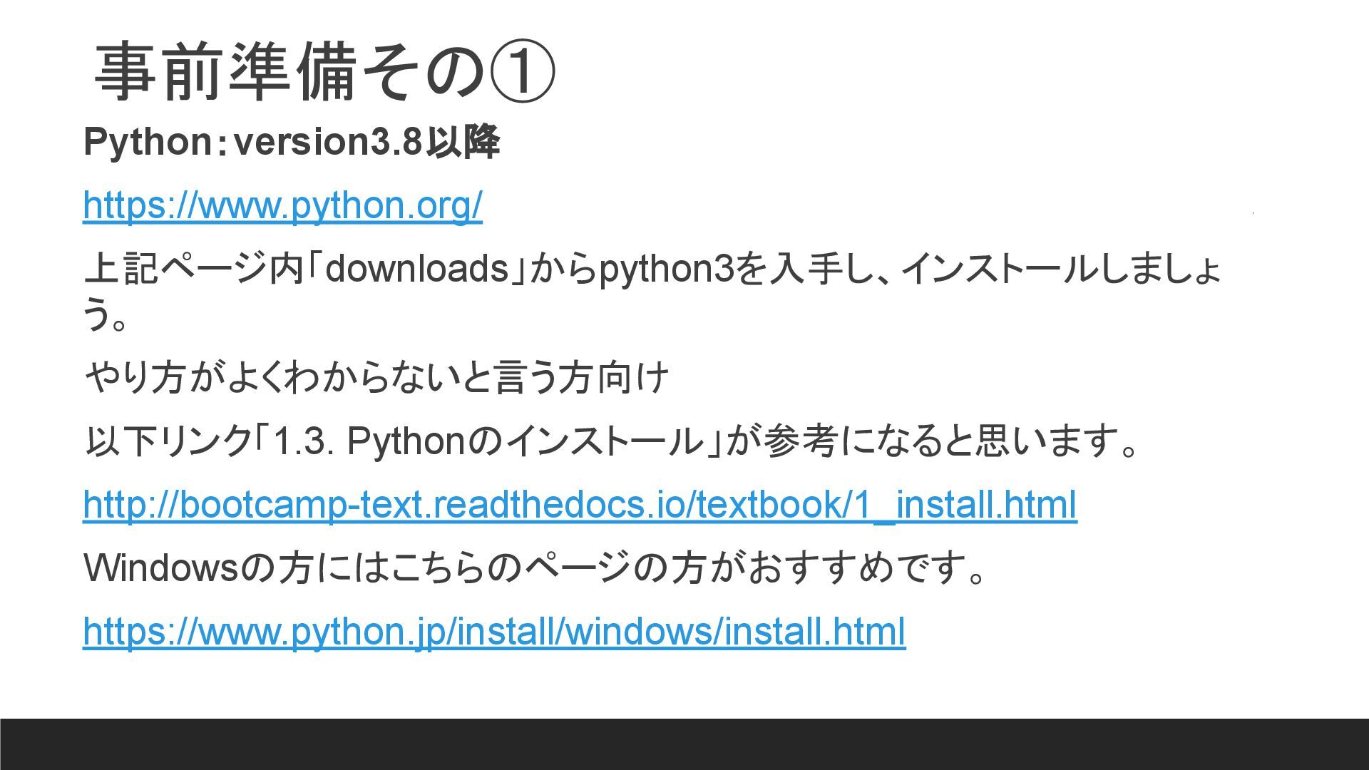 事前準備その① Python:version3.8以降 https://www.python.org/ 上記ページ内「downloads」からpython3を入手し、インストールしましょ う。 やり方がよくわからないと言う方向け 以下リンク「1.3. Pythonのインストール」が参考になると思います。 http://bootcamp-text.readthedocs.io/textbook/1_install.html Windowsの方にはこちらのページの方がおすすめです。