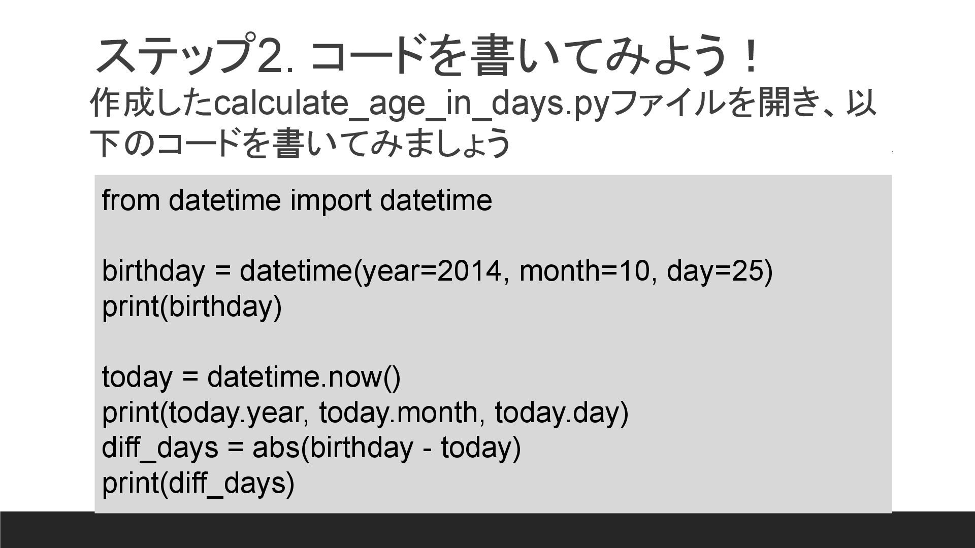 ステップ2. コードを書いてみよう! 作成したcalculate_age_in_days.pyファイルを開き、以 下のコードを書いてみましょう from datetime import datetime birthday =