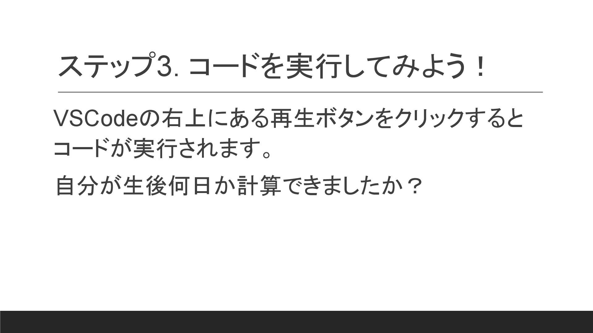 VSCodeの右上にある再生ボタンをクリックすると コードが実行されます。 自分が生後何日か計算できましたか? ステップ3. コードを実行してみよう!