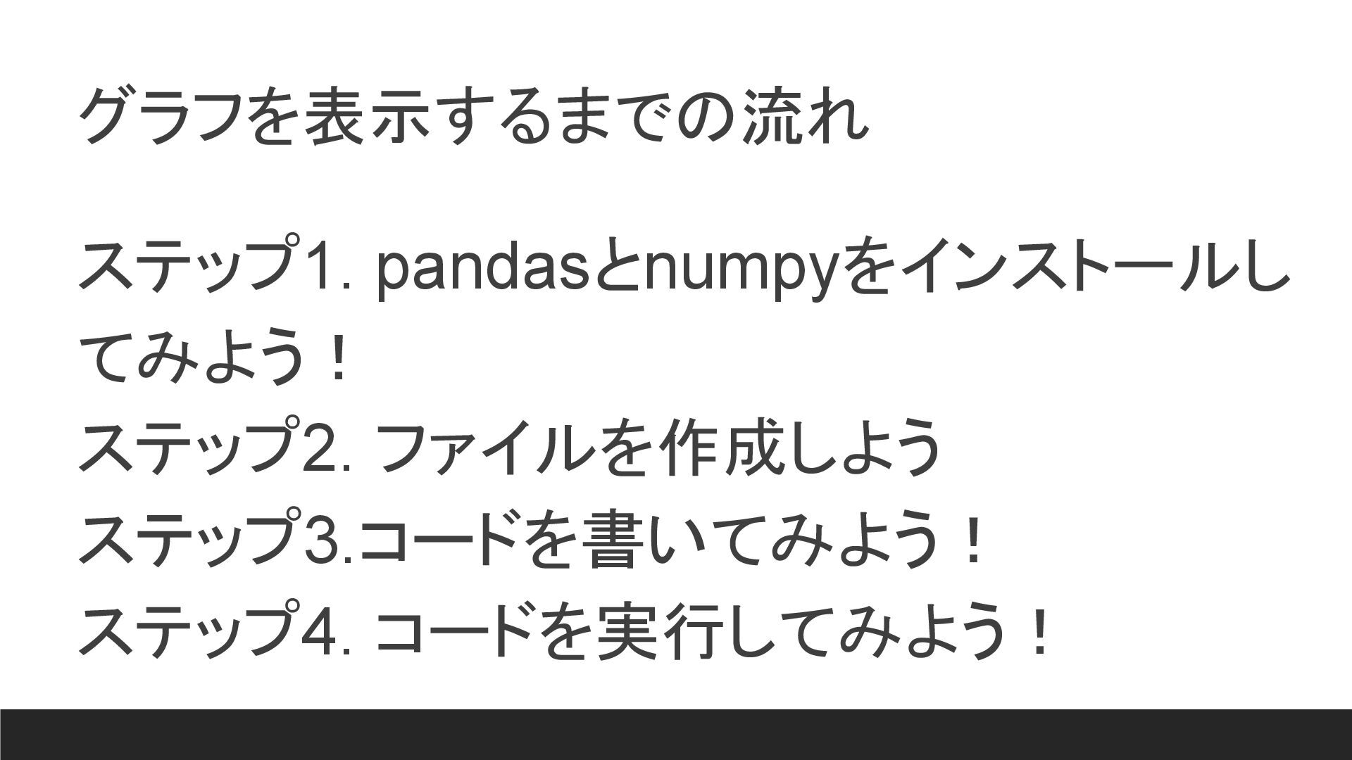 グラフを表示するまでの流れ ステップ1. pandasとnumpyをインストールし てみよう! ステップ2. ファイルを作成しよう ステップ3.コードを書いてみよう! ステップ4. コードを実行してみよう!