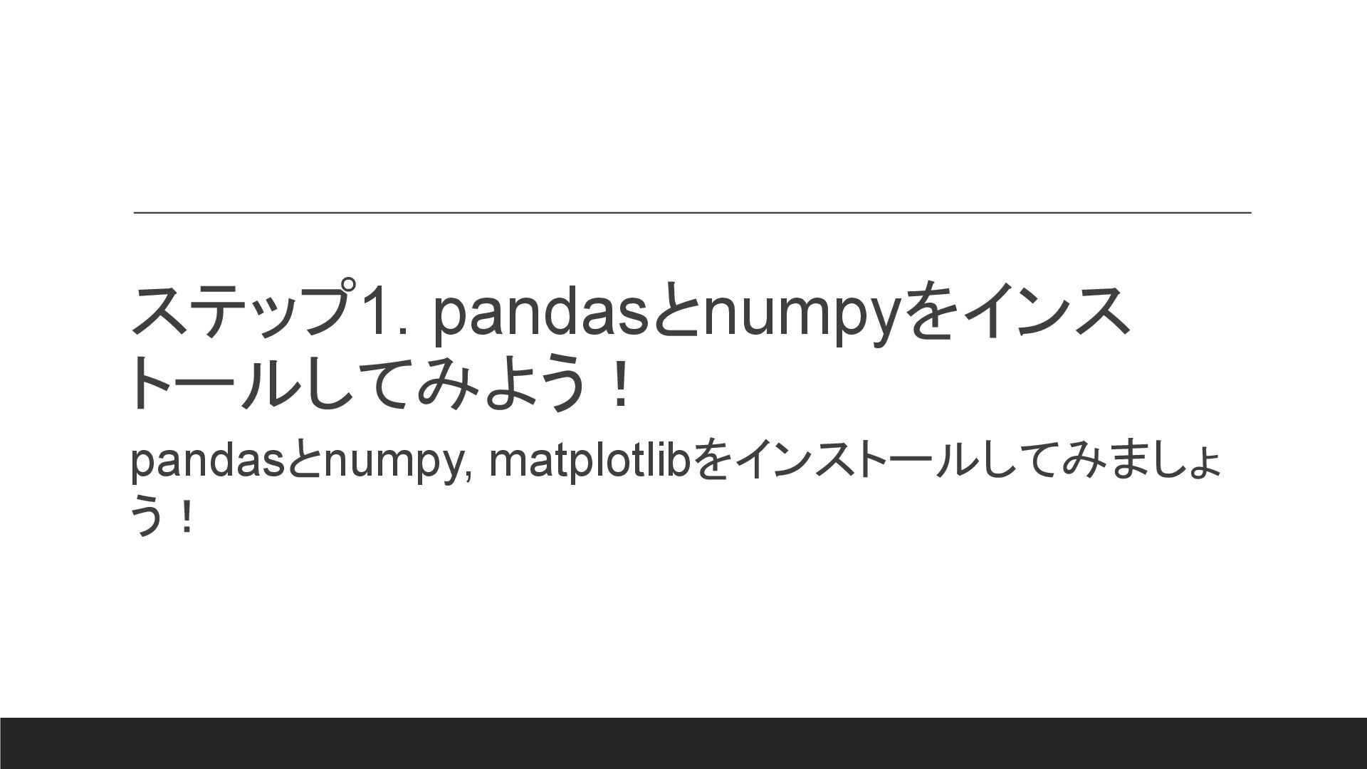 ステップ1. pandasとnumpyをインス トールしてみよう! pandasとnumpy, matplotlibをインストールしてみましょ う!