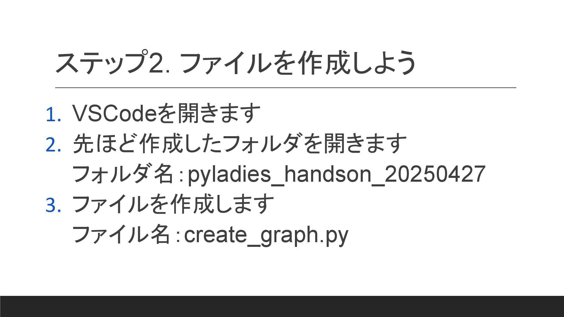 ステップ2. ファイルを作成しよう 1. VSCodeを開きます 2. 先ほど作成したフォルダを開きます フォルダ名:pyladies_handson_20250427 3. ファイルを作成します ファイル名:create_graph.py