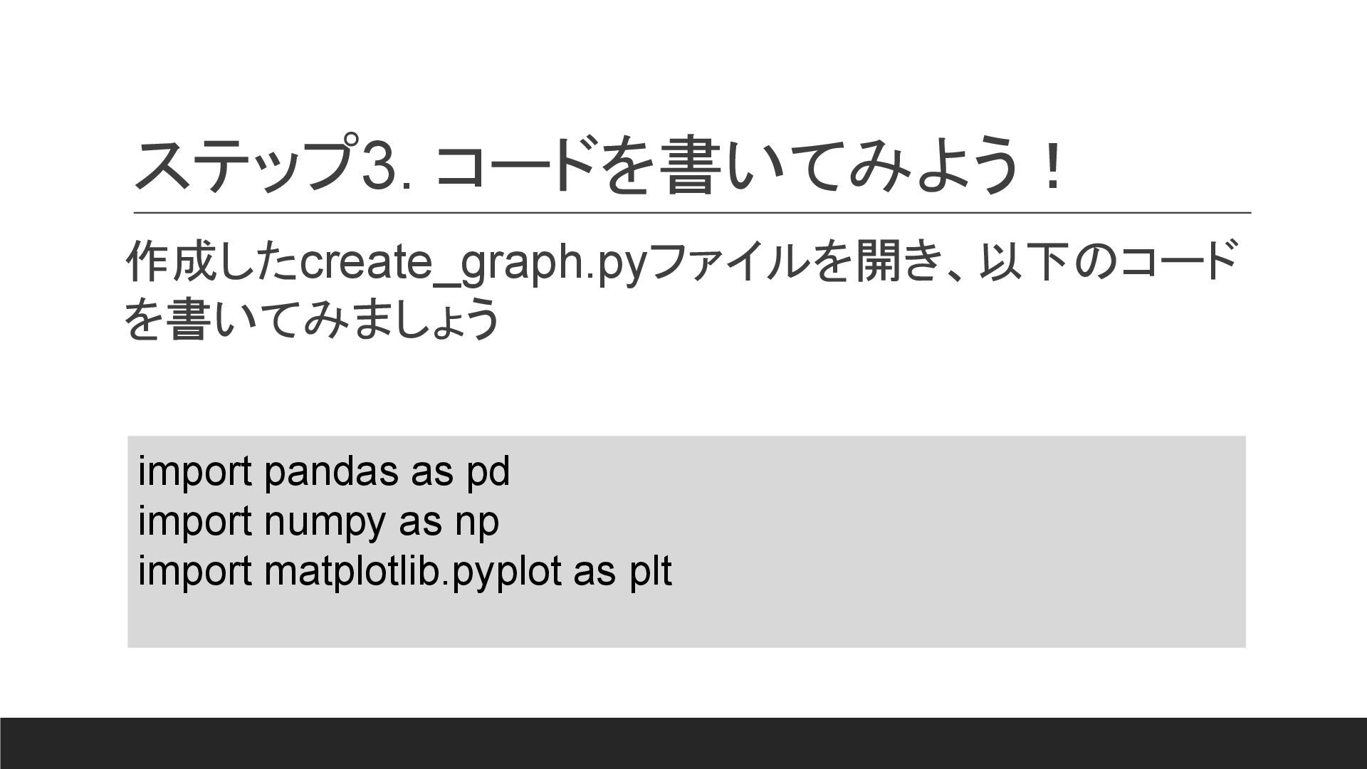 ステップ3. コードを書いてみよう! 作成したcreate_graph.pyファイルを開き、以下のコード を書いてみましょう import pandas as pd import numpy