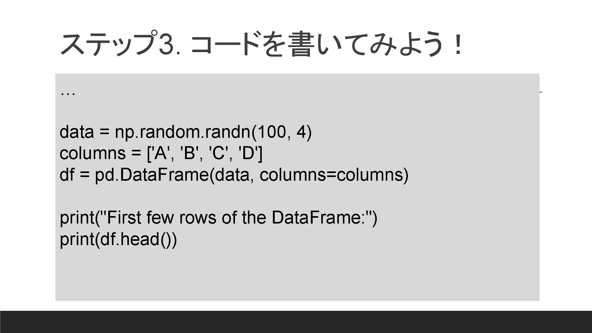 ステップ3. コードを書いてみよう! … data = np.random.randn(100, 4) columns = ['A',