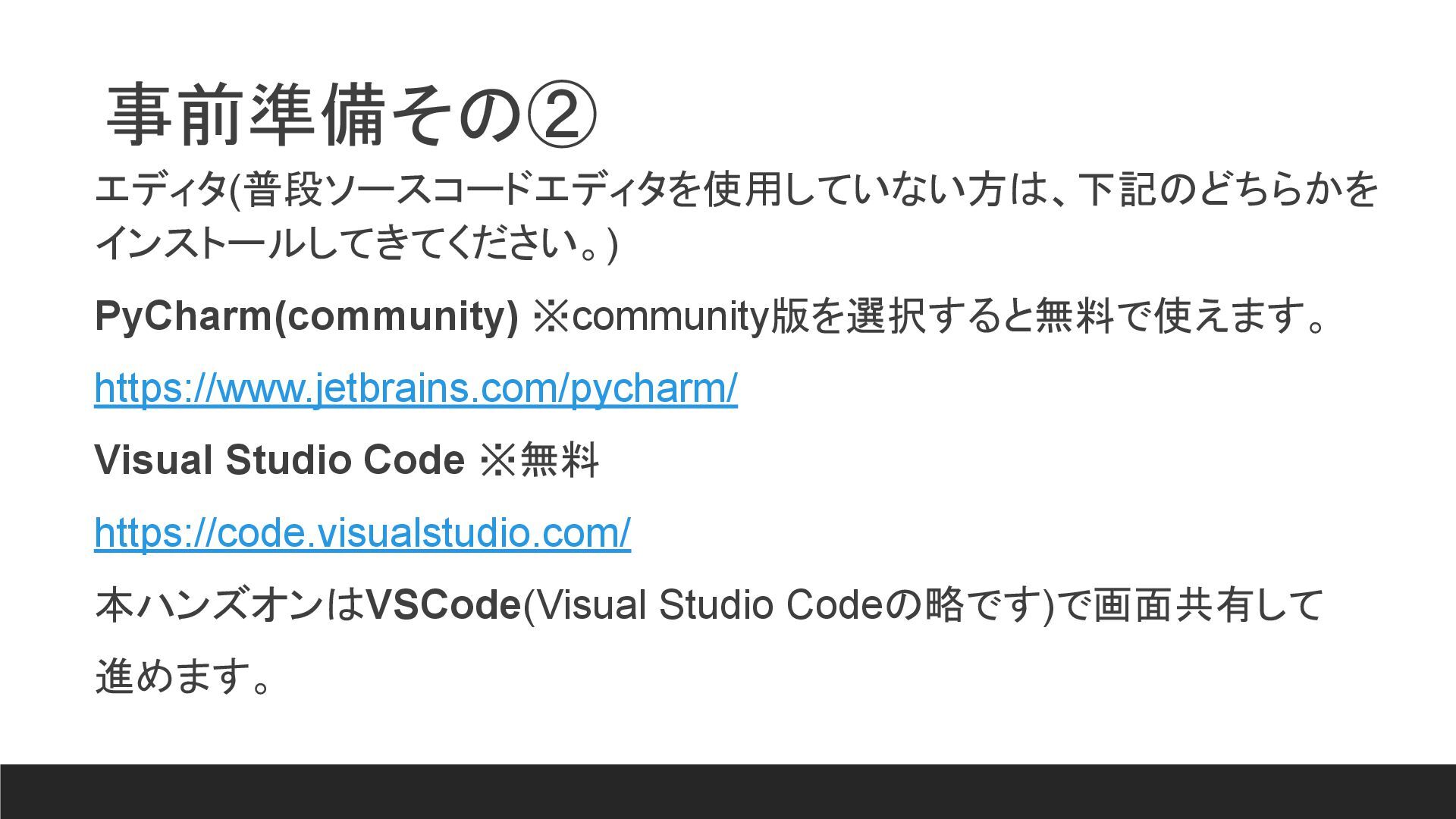 事前準備その② エディタ(普段ソースコードエディタを使用していない方は、下記のどちらかを インストールしてきてください。) PyCharm(community) ※community版を選択すると無料で使えます。 https://www.jetbrains.com/pycharm/ Visual Studio Code ※無料