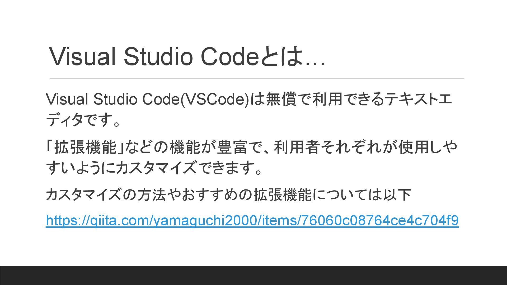 Visual Studio Codeとは… Visual Studio Code(VSCode)は無償で利用できるテキストエ ディタです。 「拡張機能」などの機能が豊富で、利用者それぞれが使用しや すいようにカスタマイズできます。 カスタマイズの方法やおすすめの拡張機能については以下