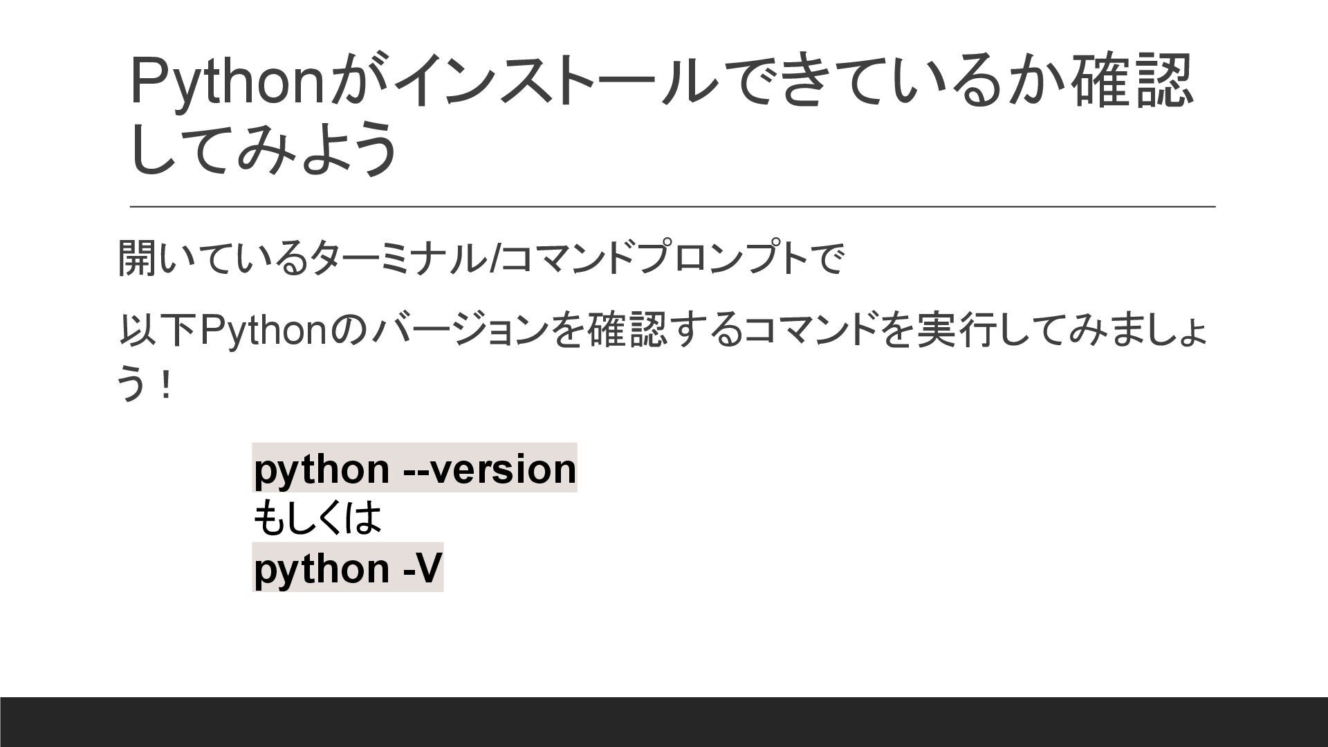 Pythonがインストールできているか確認 してみよう 開いているターミナル/コマンドプロンプトで 以下Pythonのバージョンを確認するコマンドを実行してみましょ う! python --version もしくは python -V