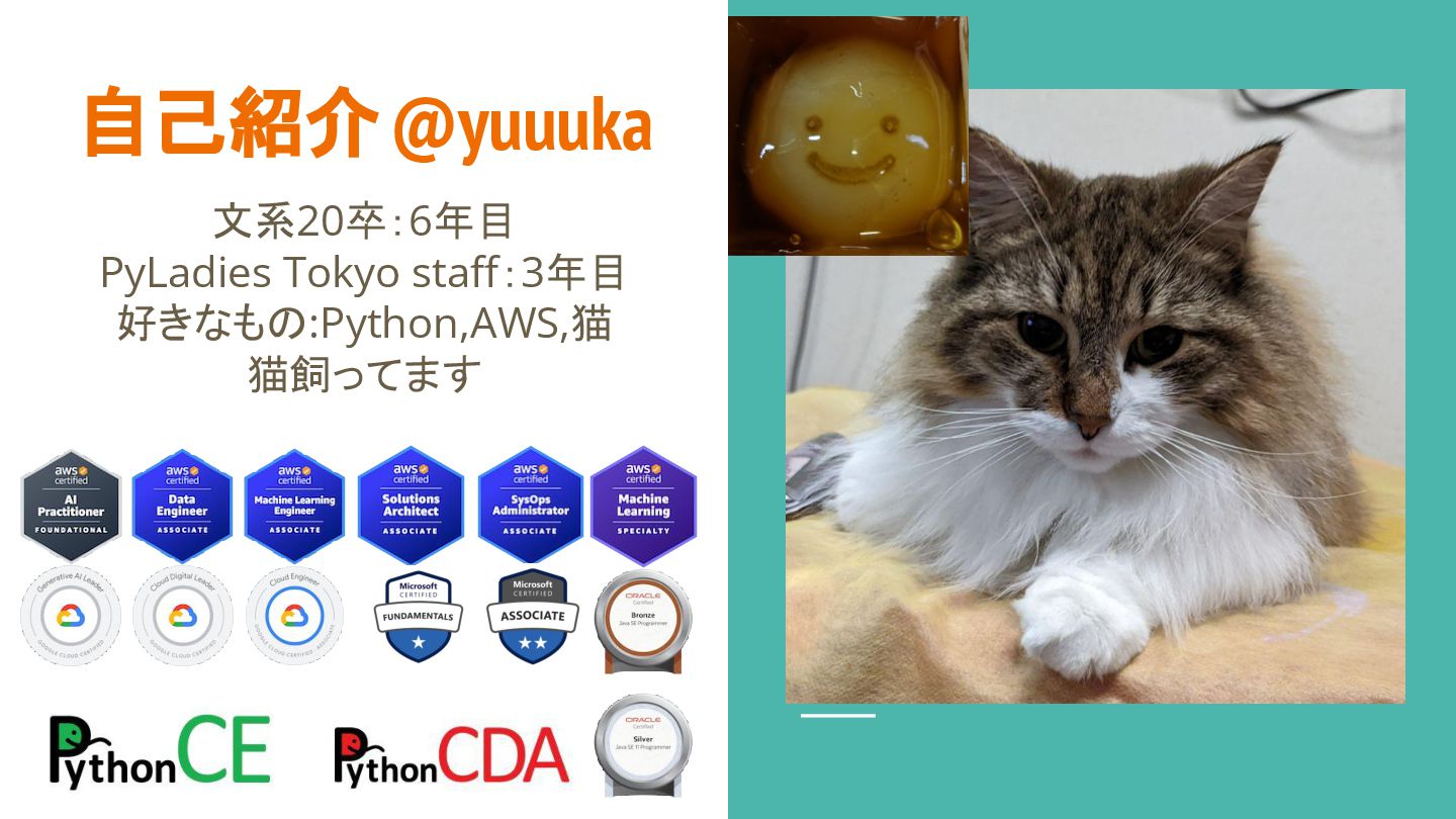 自己紹介@yuuuka 文系20卒:6年目 PyLadies Tokyo staff:3年目 好きなもの:Python,AWS,猫 猫飼ってます
