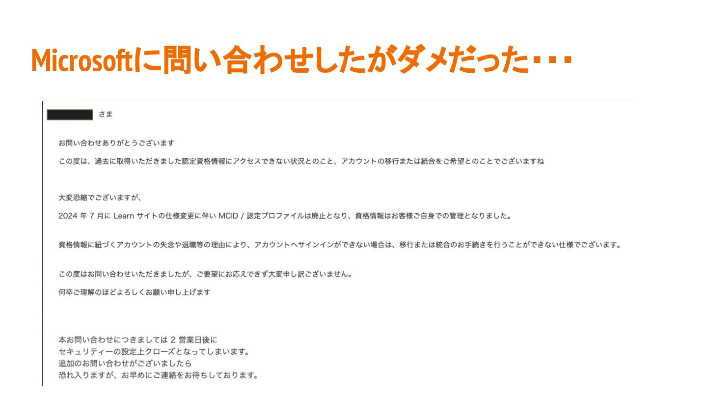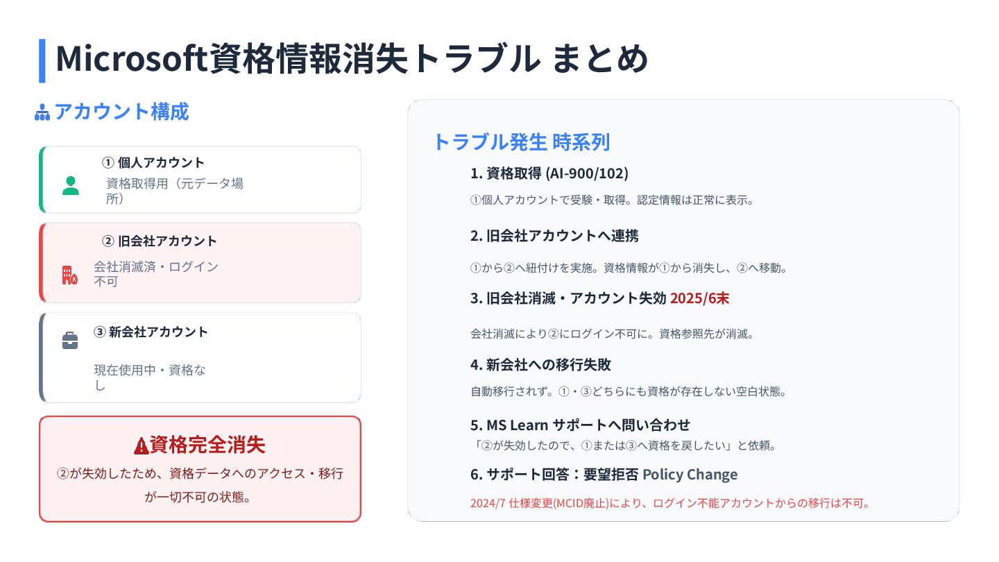 会社消滅済‧ログイン 不可 現在使⽤中‧資格な し 1. 資格取得 (AI-900/102) ①個⼈アカウントで受験‧取得。認定情報は正常に表⽰。 2. 旧会社アカウントへ連携 ①から②へ紐付けを実施。資格情報が①から消失し、②へ移動。 3. 旧会社消滅‧アカウント失効 2025/6末 会社消滅により②にログイン不可に。資格参照先が消滅。 4. 新会社への移⾏失敗 ⾃動移⾏されず。①‧③どちらにも資格が存在しない空⽩状態。 5. MS Learn サポートへ問い合わせ 「②が失効したので、①または③へ資格を戻したい」と依頼。 6. サポート回答:要望拒否 Policy Change 2024/7 仕様変更(MCID廃⽌)により、ログイン不能アカウントからの移⾏は不可。 ① 個⼈アカウント ② 旧会社アカウント ③ 新会社アカウント