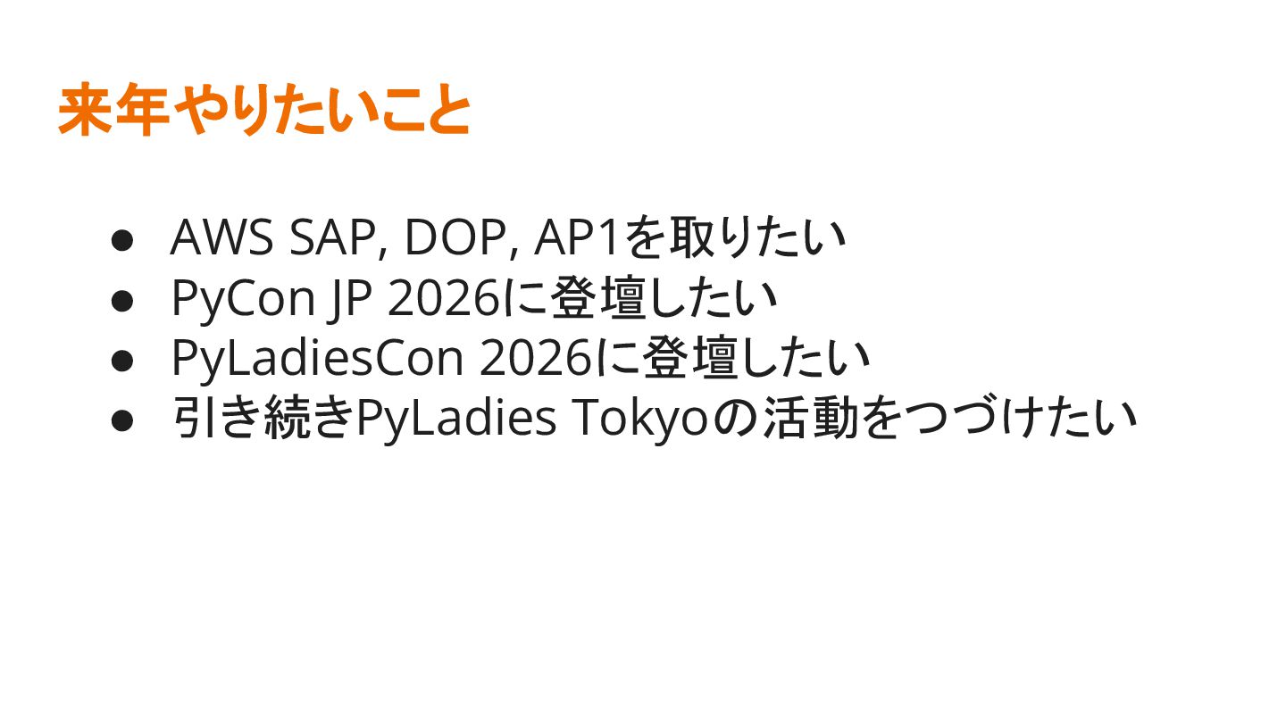 来年やりたいこと • AWS SAP, DOP, AP1を取りたい • PyCon JP 2026に登壇したい