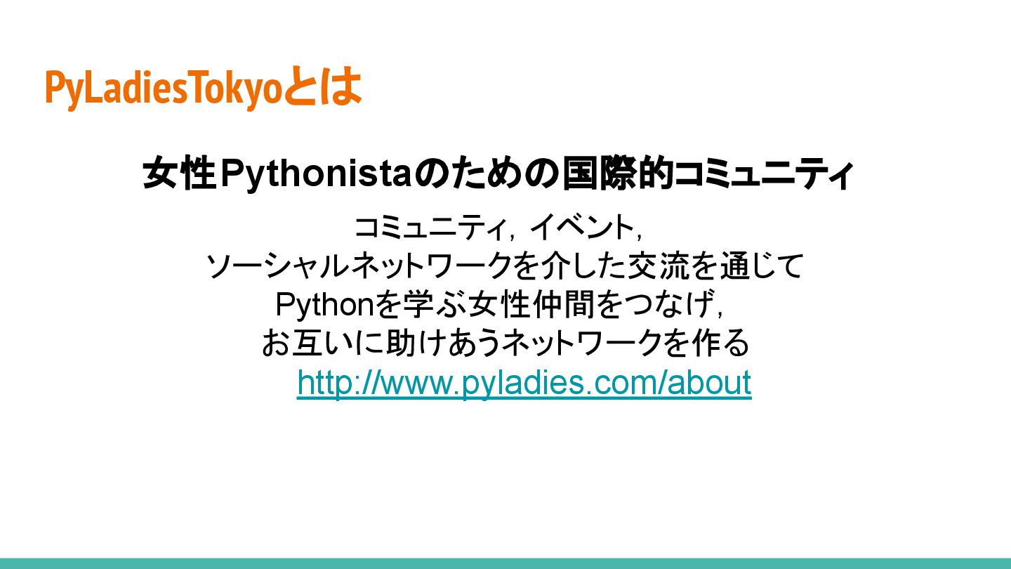 PyLadiesTokyoとは 女性Pythonistaのための国際的コミュニティ コミュニティ,イベント, ソーシャルネットワークを介した交流を通じて Pythonを学ぶ女性仲間をつなげ, お互いに助けあうネットワークを作る http://www.pyladies.com/about