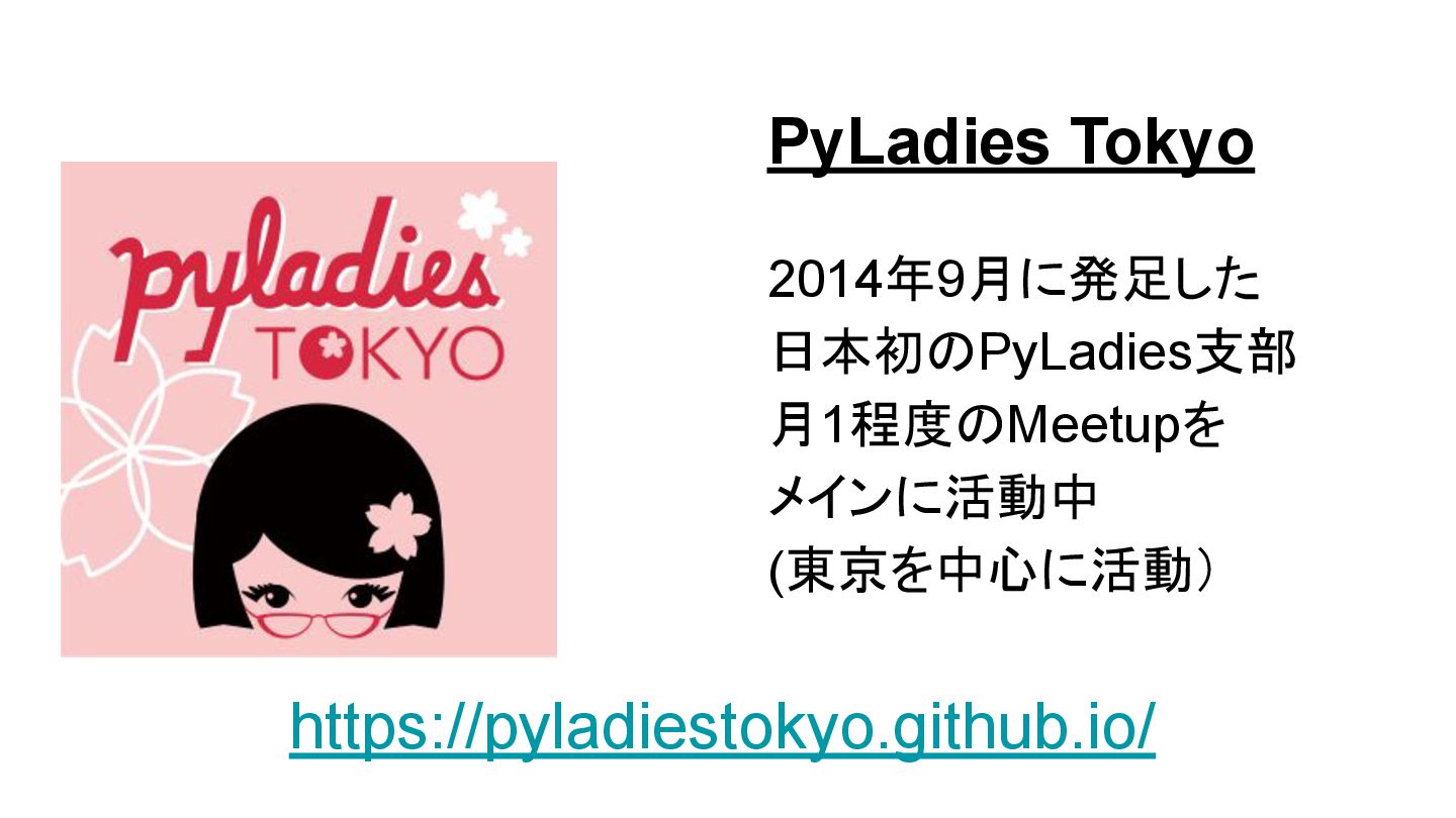 https://pyladiestokyo.github.io/ PyLadies Tokyo 2014年9月に発足した 日本初のPyLadies支部 月1程度のMeetupを メインに活動中 (東京を中心に活動)