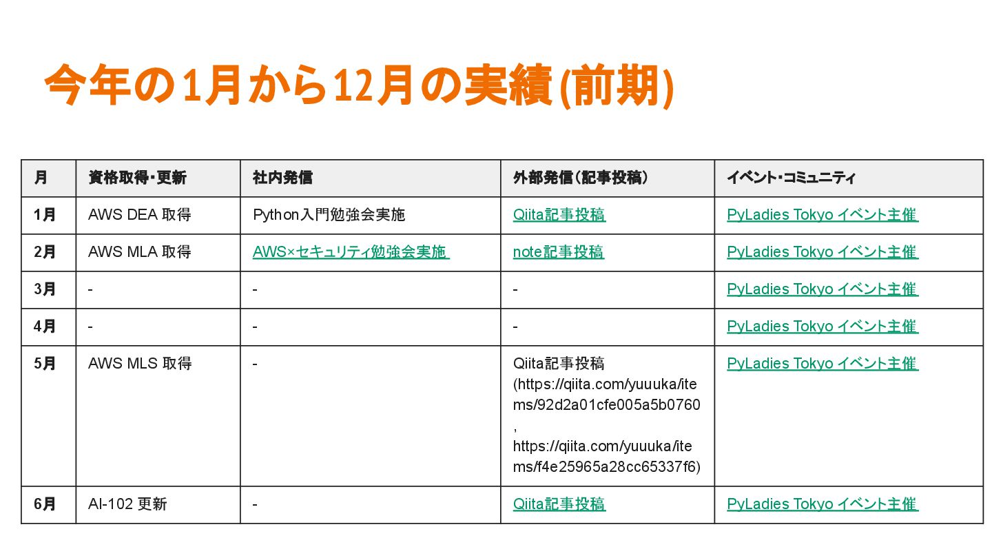 今年の1月から12月の実績(前期) 月 資格取得・更新 社内発信 外部発信(記事投稿) イベント・コミュニティ 1月 AWS DEA 取得