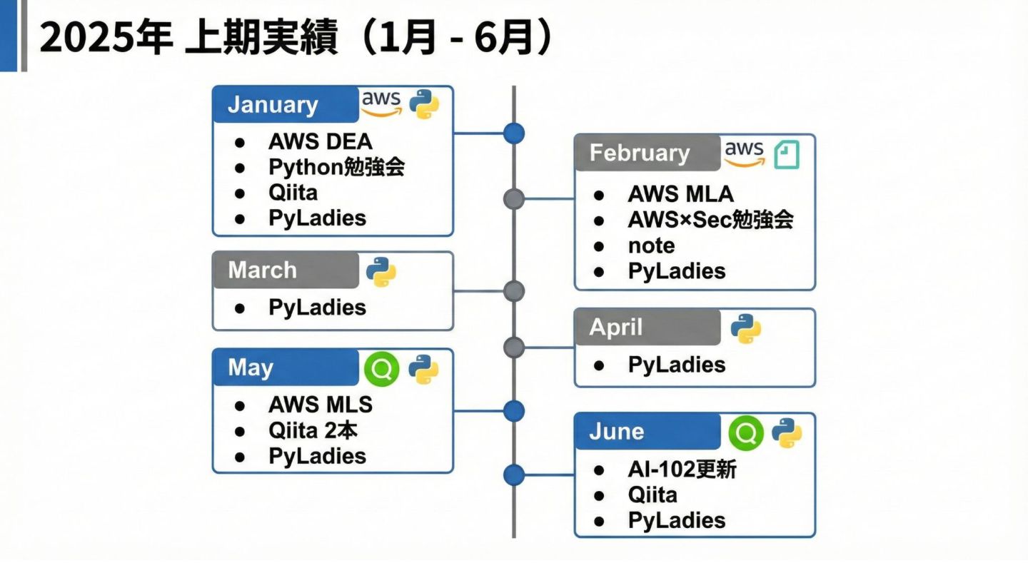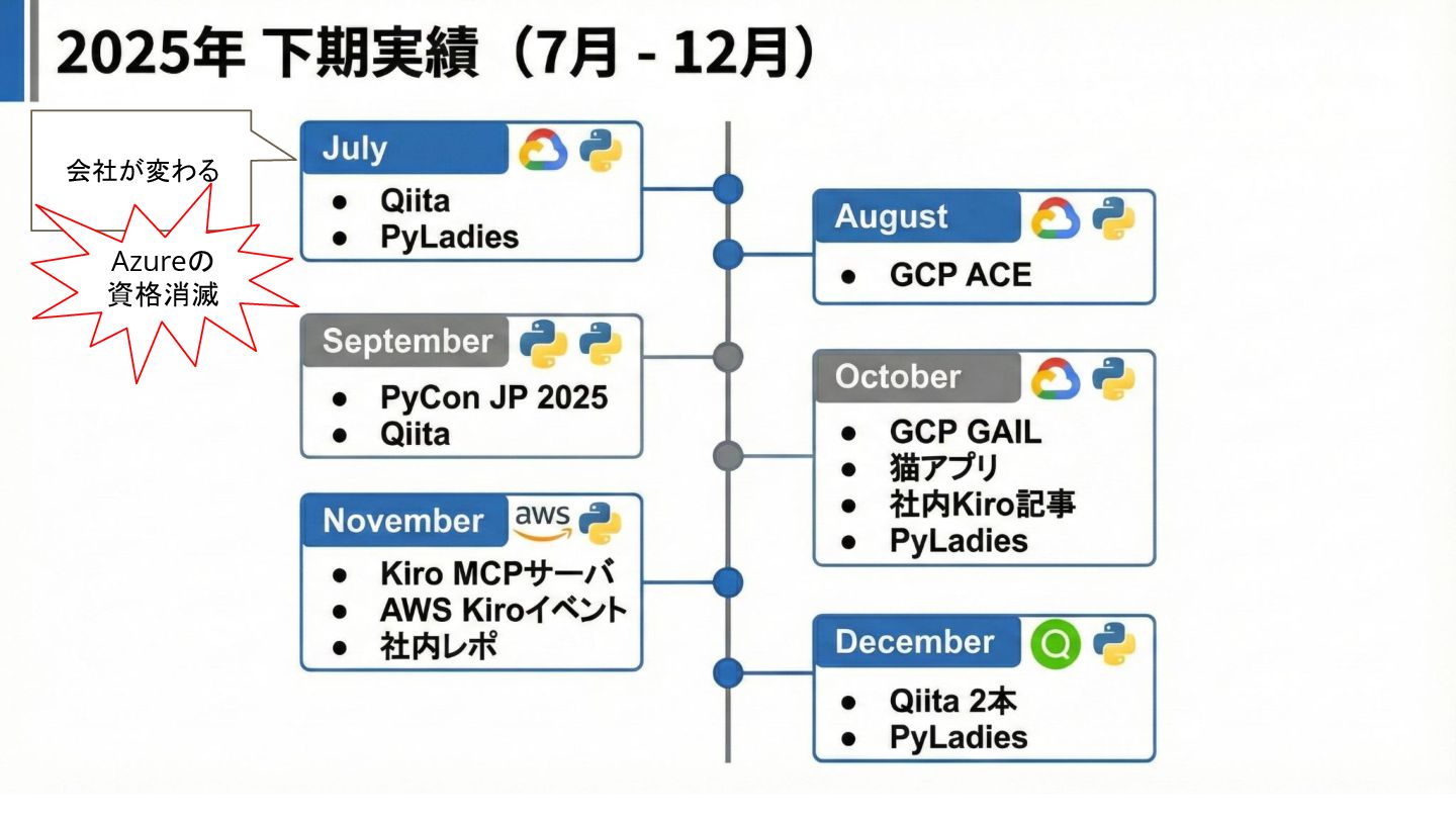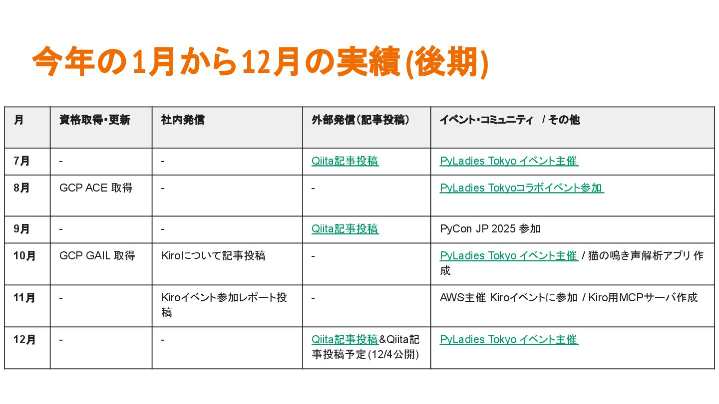 - Qiita記事投稿 PyLadies Tokyo イベント主催 8月 GCP ACE 取得 - - PyLadies Tokyoコラボイベント参加 9月 - - Qiita記事投稿 PyCon JP 2025 参加 10月 GCP GAIL 取得 Kiroについて記事投稿 - PyLadies Tokyo イベント主催 / 猫の鳴き声解析アプリ 作 成 11月 - Kiroイベント参加レポート投 稿 - AWS主催 Kiroイベントに参加 / Kiro用MCPサーバ作成 12月 - - Qiita記事投稿&Qiita記 事投稿予定(12/4公開) PyLadies Tokyo イベント主催