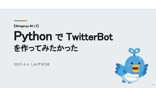 【Shingen.py #4 LT】 Python で TwitterBot を作ってみたかった 2019. 4. 6 しみず