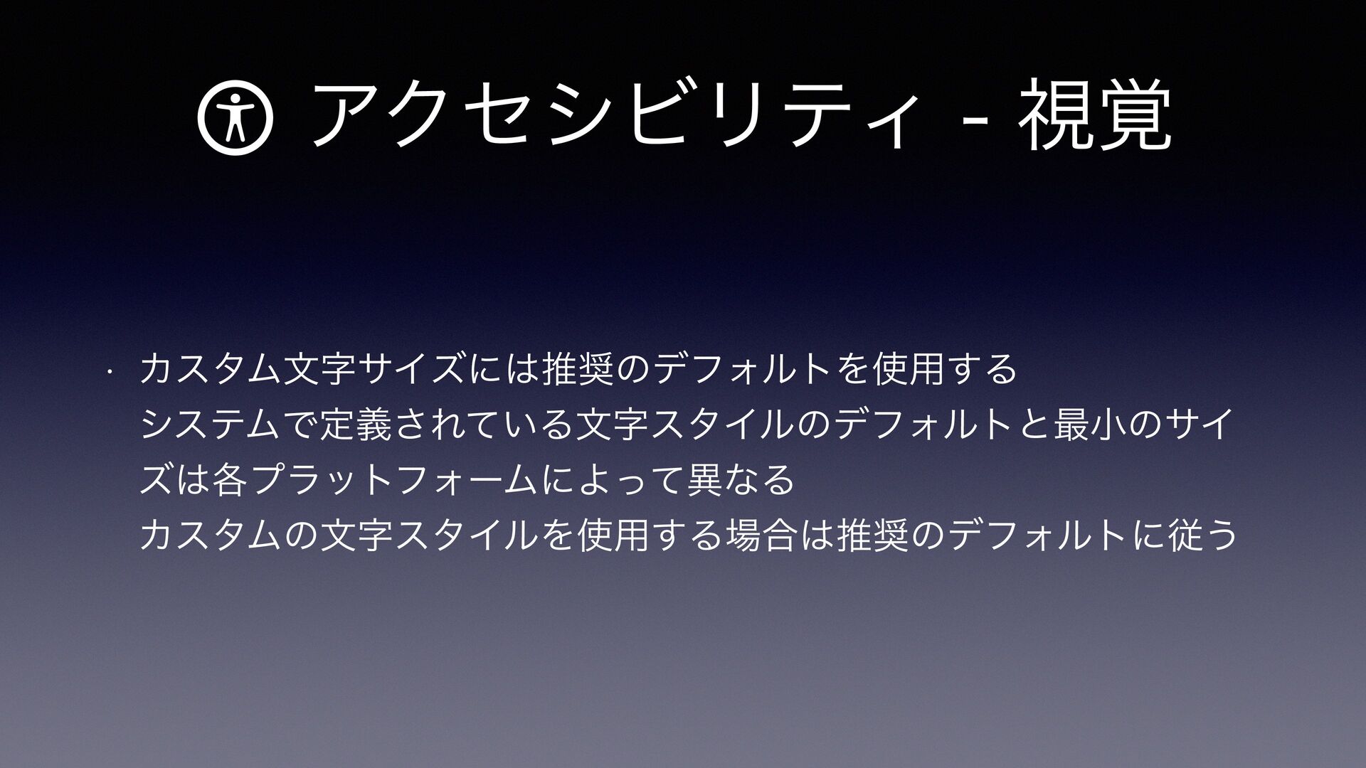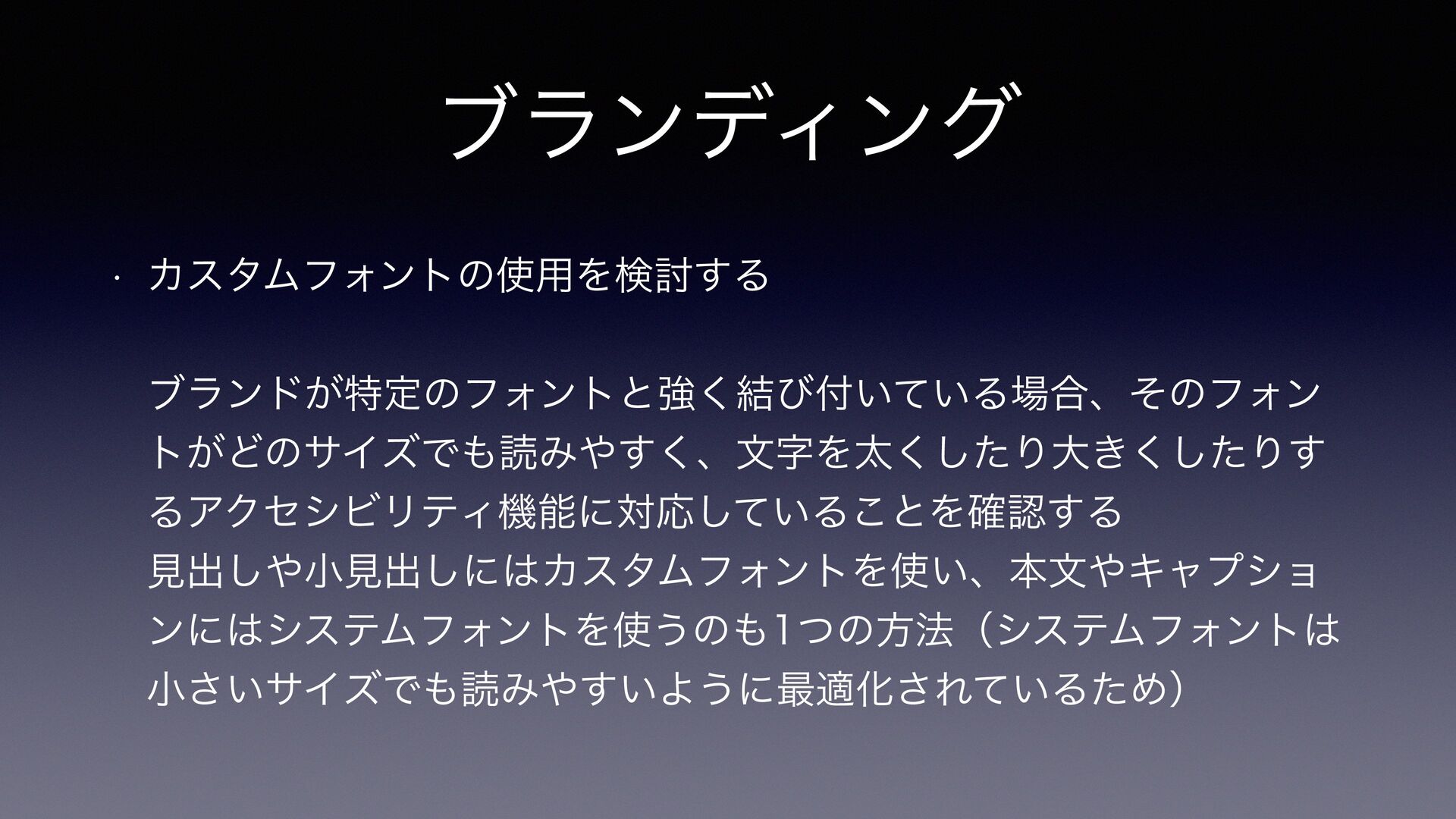 w ΧελϜϑΥϯτͷ༻Λݕ౼͢Δ ϒϥϯυ͕ಛఆͷϑΥϯτͱڧ݁͘ͼ͍͍ͯΔ߹ɺͦͷϑΥϯ τ͕ͲͷαΠζͰಡΈ͘͢ɺจࣈΛଠͨ͘͠Γେ͖ͨ͘͠Γ͢ ΔΞΫηγϏϦςΟػೳʹରԠ͍ͯ͠Δ͜ͱΛ֬ೝ͢Δ ݟग़͠খݟग़͠ʹΧελϜϑΥϯτΛ͍ɺຊจΩϟϓγϣ ϯʹγεςϜϑΥϯτΛ͏ͷͭͷํ๏ʢγεςϜϑΥϯτ খ͍͞αΠζͰಡΈ͍͢Α͏ʹ࠷దԽ͞Ε͍ͯΔͨΊʣ ϒϥϯσΟϯά