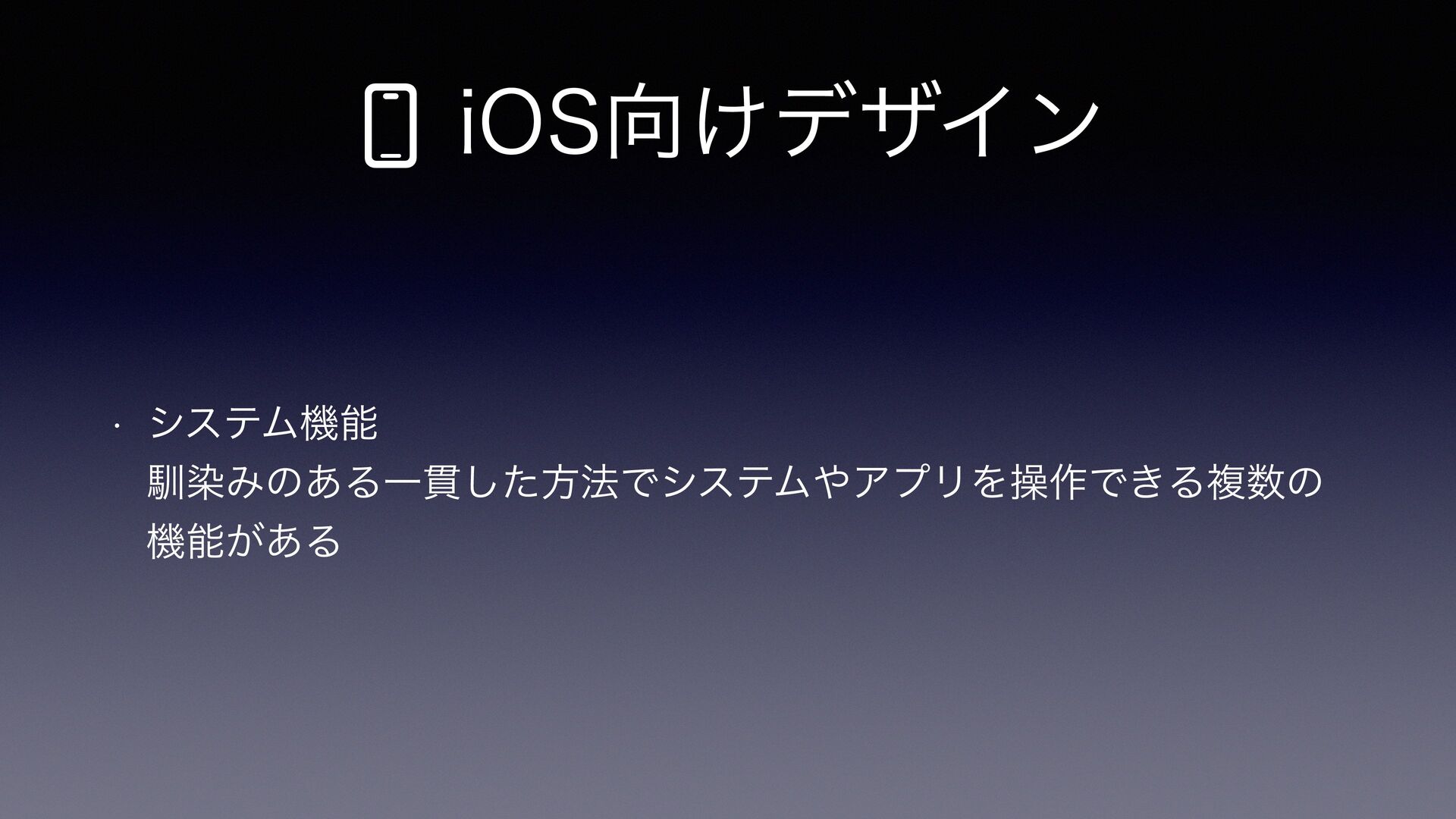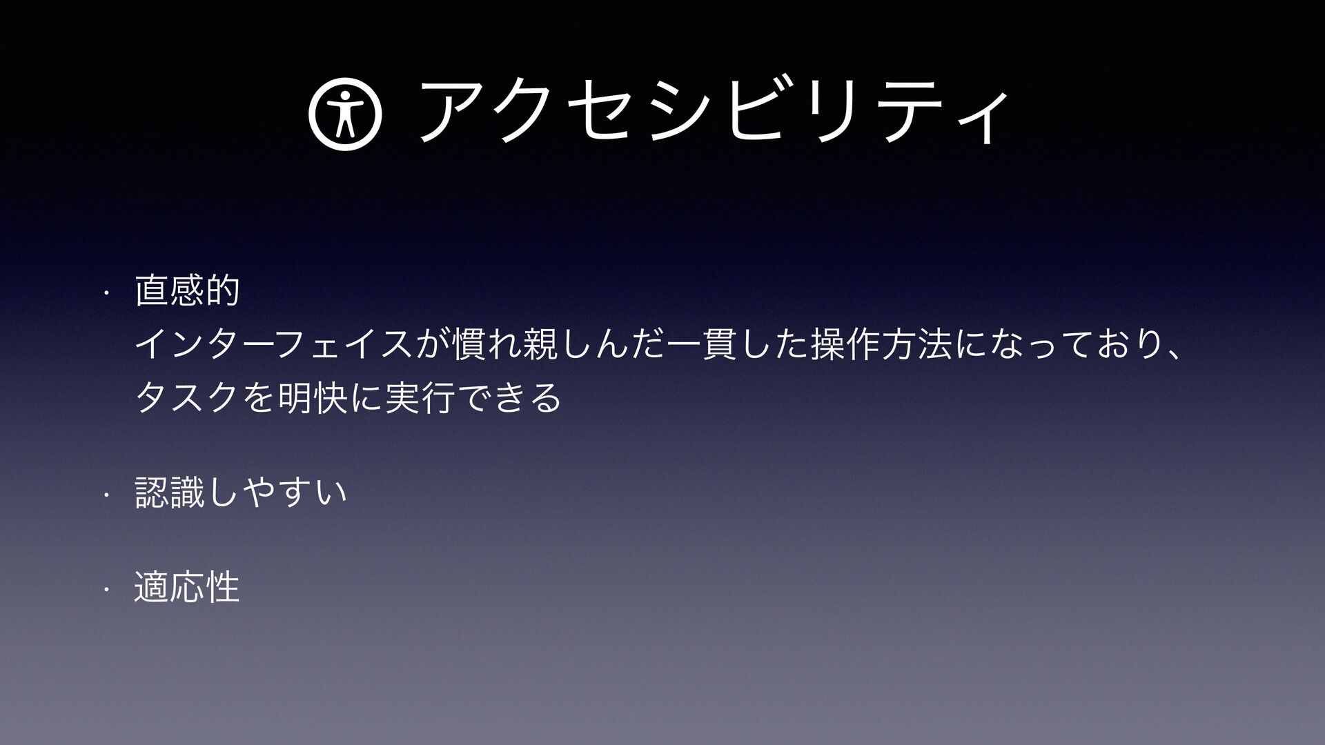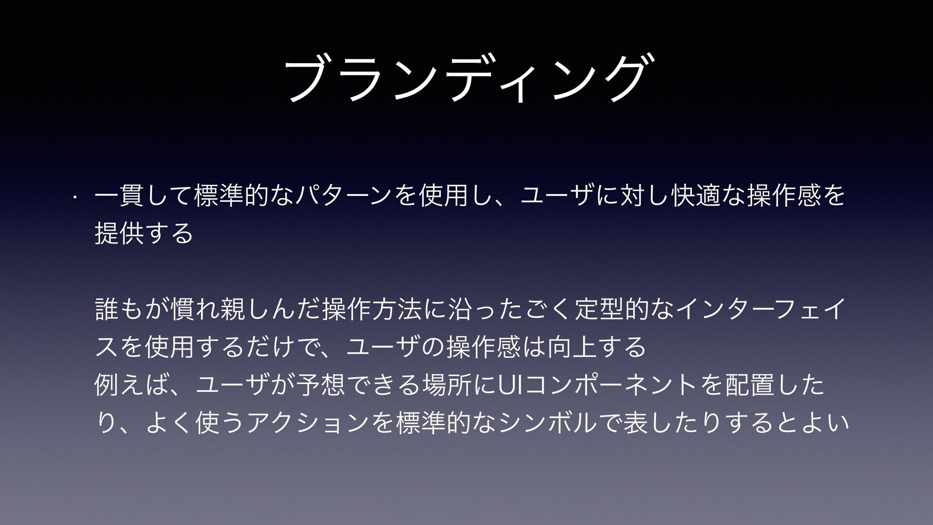 ΞΫηγϏϦςΟೝ w ΞΫγϣϯγϯϓϧͰײతͳͷʹ͢Δ ͍֮͑͢Ұ؏ͨ͠ૢ࡞ํ๏ͰΠϯλʔϑΣΠεΛҠಈͰ͖ΔΑ͏ ʹ͢Δ ֶश֮ͯ͑͠ͳ͚ΕͳΒͳ͍ΧελϜͷδΣενϟΛ࡞͢ΔΑ Γɺ͢ͰʹϢʔβ͕׳Ε͠ΜͰ͍ΔγεςϜͷδΣενϟಈ ࡞Λ༏ઌ͢Δ