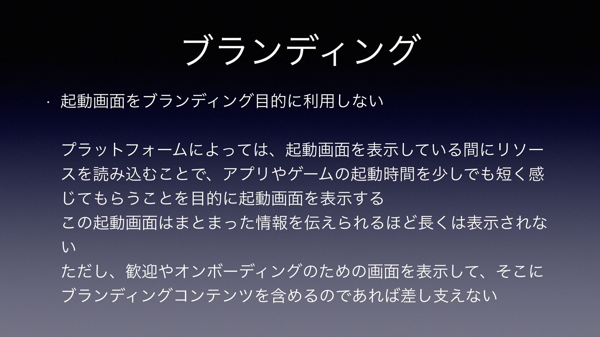 w ىಈը໘ΛϒϥϯσΟϯάతʹར༻͠ͳ͍ ϓϥοτϑΥʔϜʹΑͬͯɺىಈը໘Λද͍ࣔͯ͠ΔؒʹϦιʔ εΛಡΈࠐΉ͜ͱͰɺΞϓϦήʔϜͷىಈ࣌ؒΛগ͠Ͱ͘ײ ͯ͡Β͏͜ͱΛతʹىಈը໘Λදࣔ͢Δ ͜ͷىಈը໘·ͱ·ͬͨใΛ͑ΒΕΔ΄Ͳ͘දࣔ͞Εͳ ͍ ͨͩ͠ɺܴΦϯϘʔσΟϯάͷͨΊͷը໘Λදࣔͯ͠ɺͦ͜ʹ ϒϥϯσΟϯάίϯςϯπΛؚΊΔͷͰ͋Εࠩ͠ࢧ͑ͳ͍