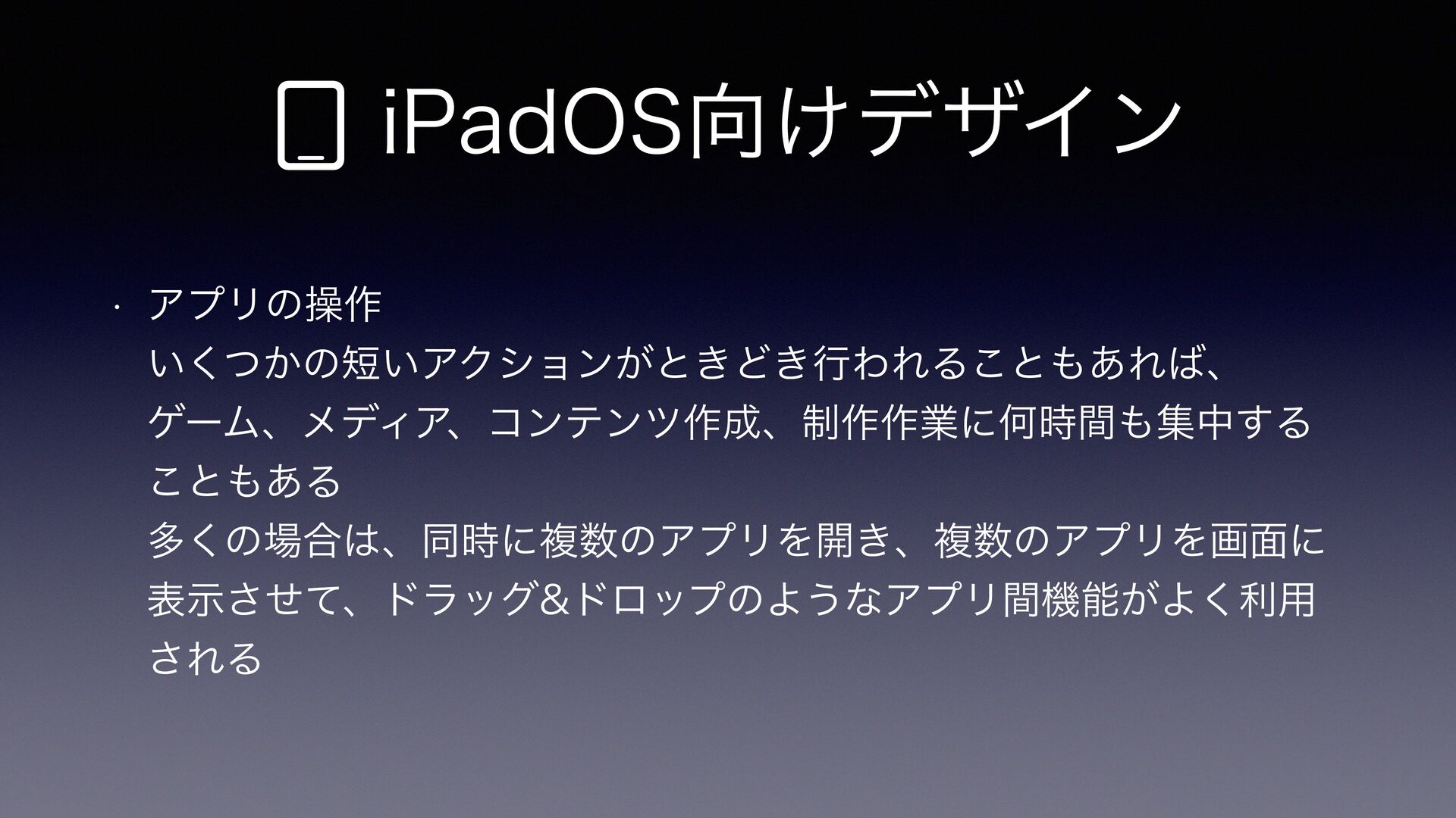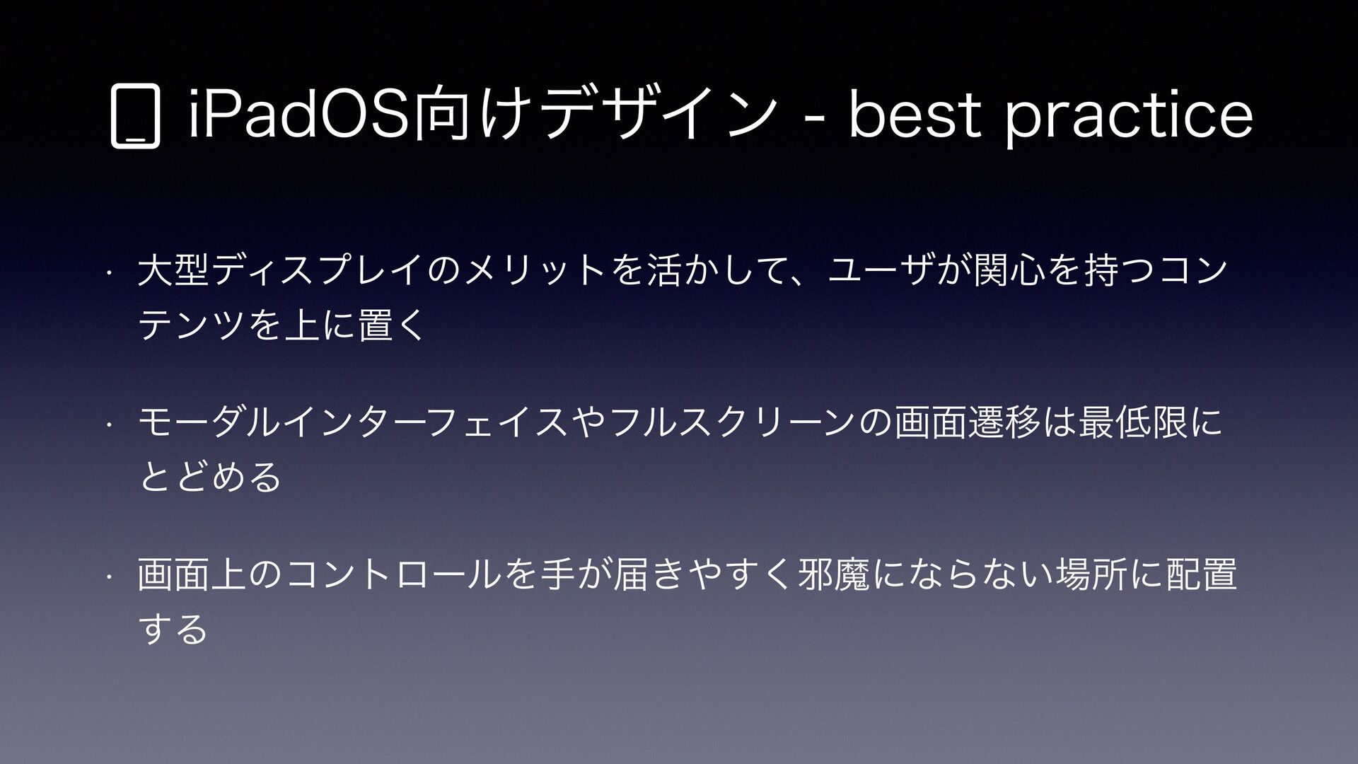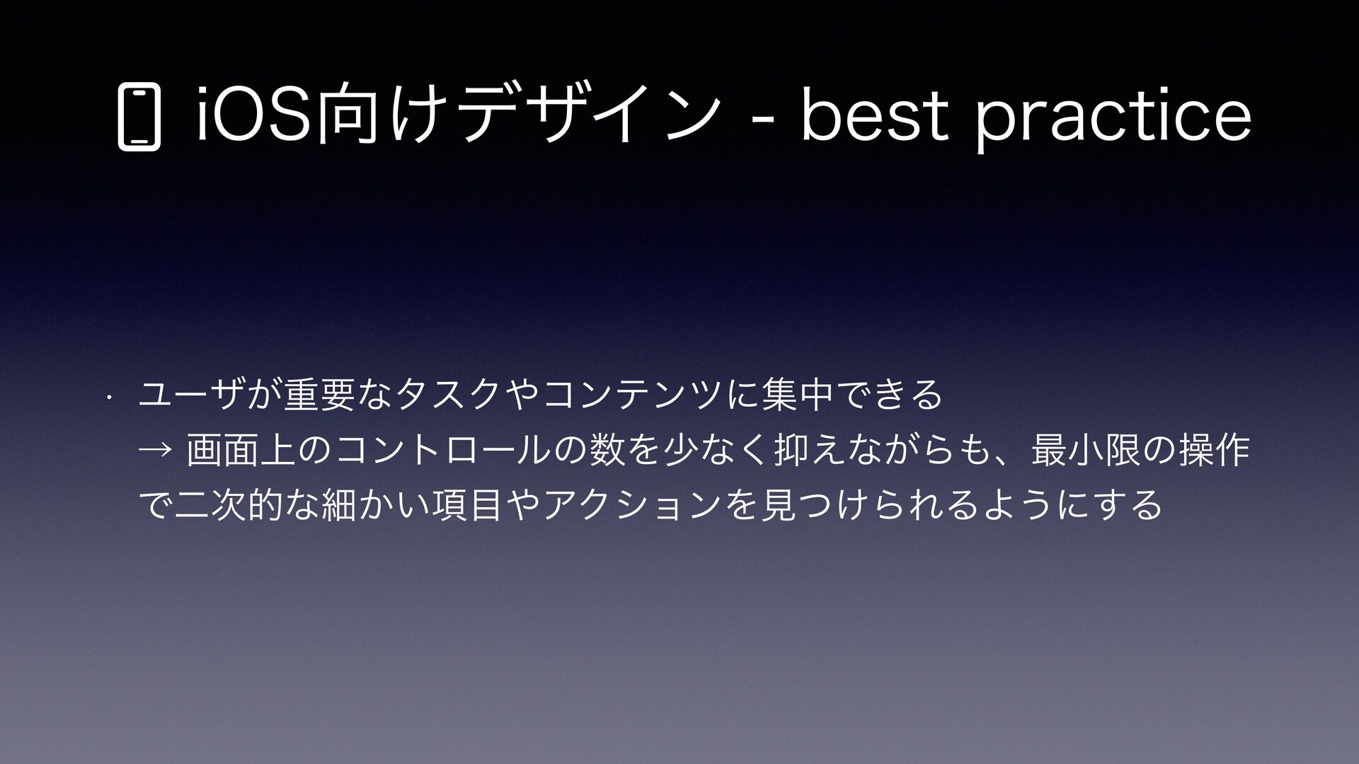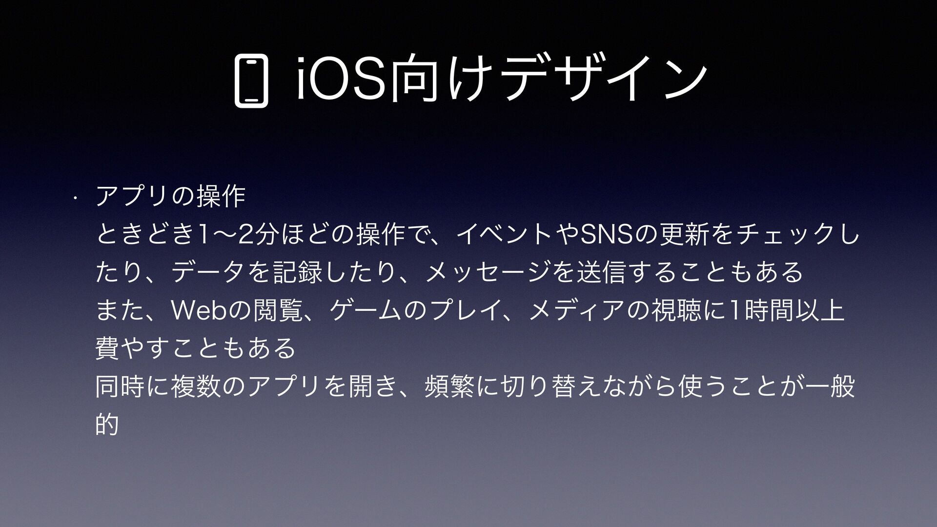 ΧϥʔϓϥοτϑΥʔϜͷߟྀࣄ߲ w J04J1BE04 TZTUFNͱHSPVQFEͷഎܠ৭͕͋ΓɺͦΕͧΕ͔࣍Β࣍·Ͱ༻ҙ ͞Ε͍ͯΔ ͜ΕʹΑΓɺ֊తʹใΛ͑Δ͜ͱ͕Ͱ͖Δ ࣍ɿશମͷϏϡʔͷഎܠ ࣍ɿશମͷϏϡʔͷதʹ͋Δίϯςϯπཁૉͷάϧʔϓͷഎܠ ࣍ɿ࣍ͷཁૉʹ͋Δίϯςϯπཁૉͷάϧʔϓͷഎܠ