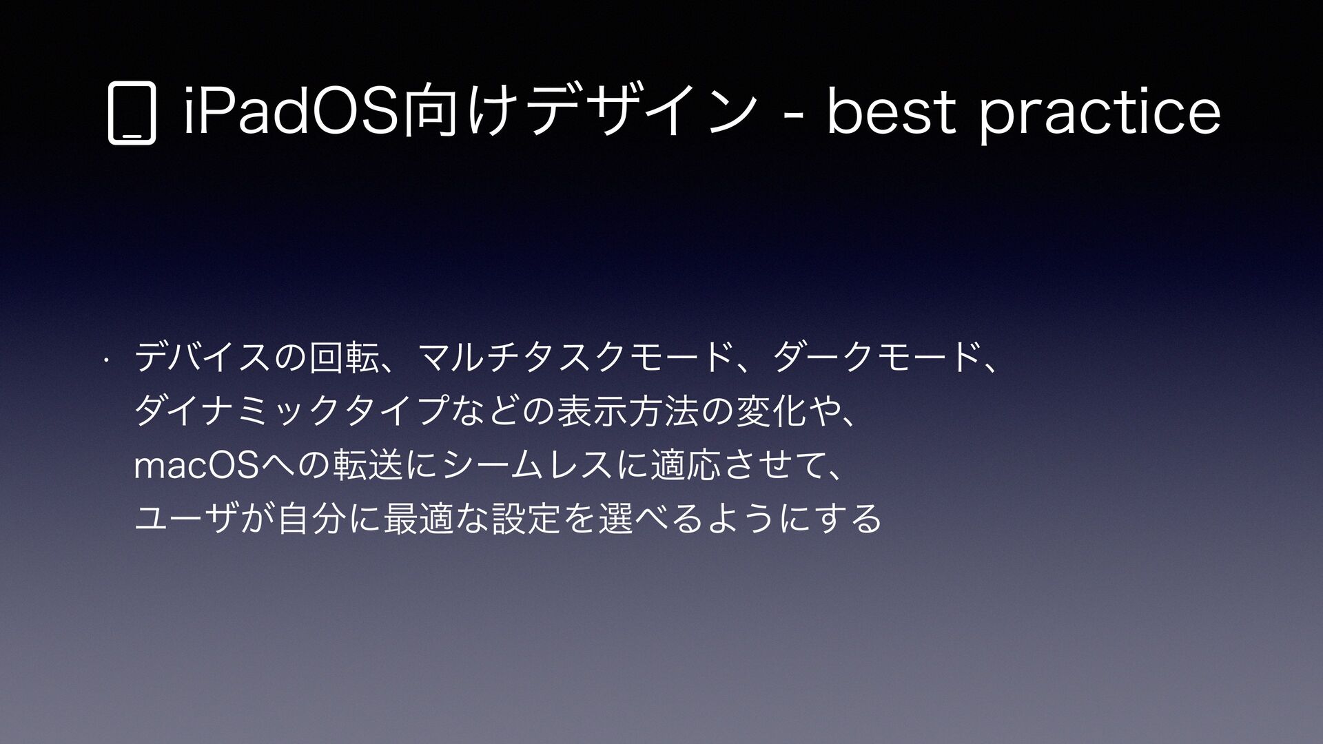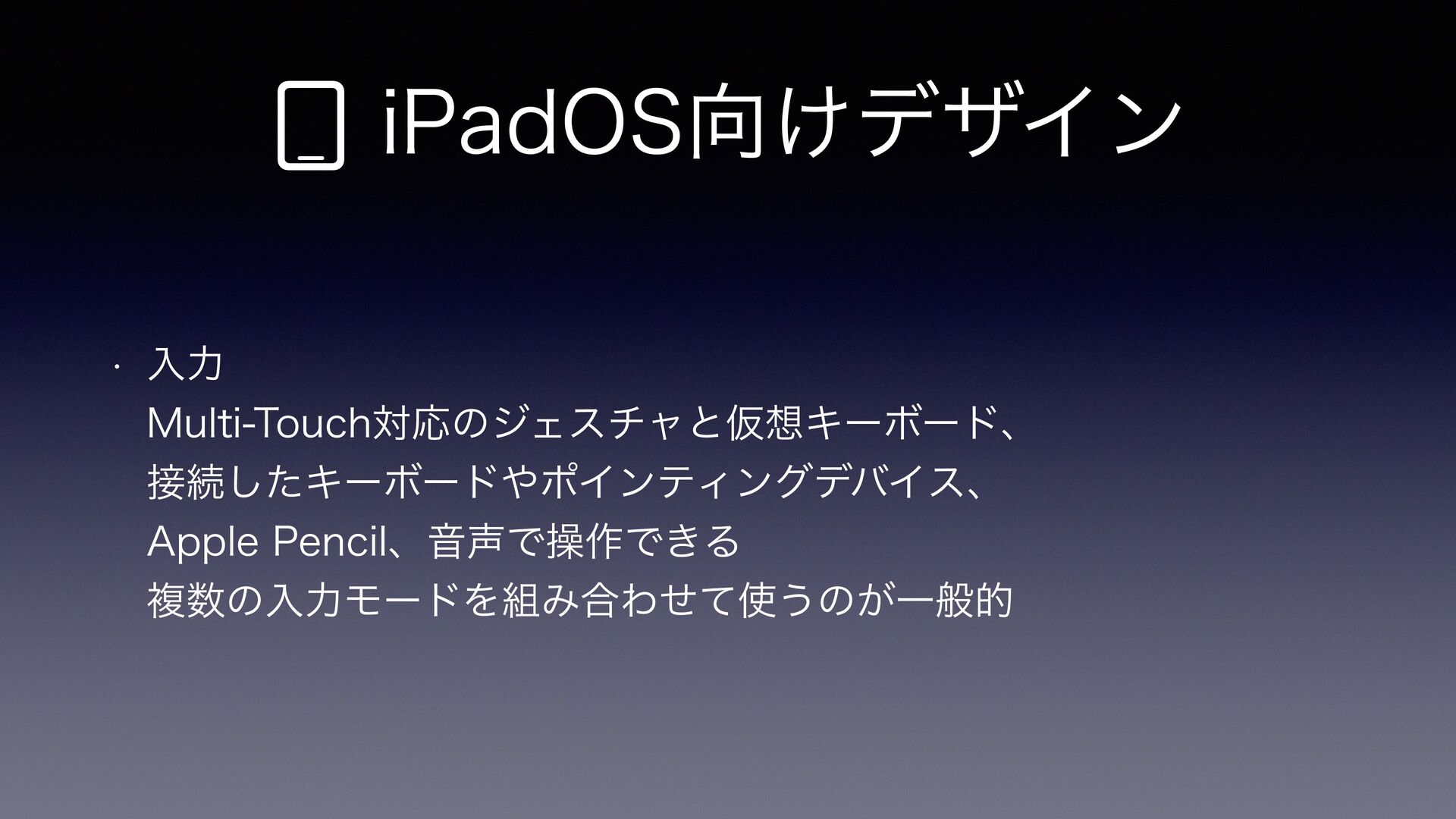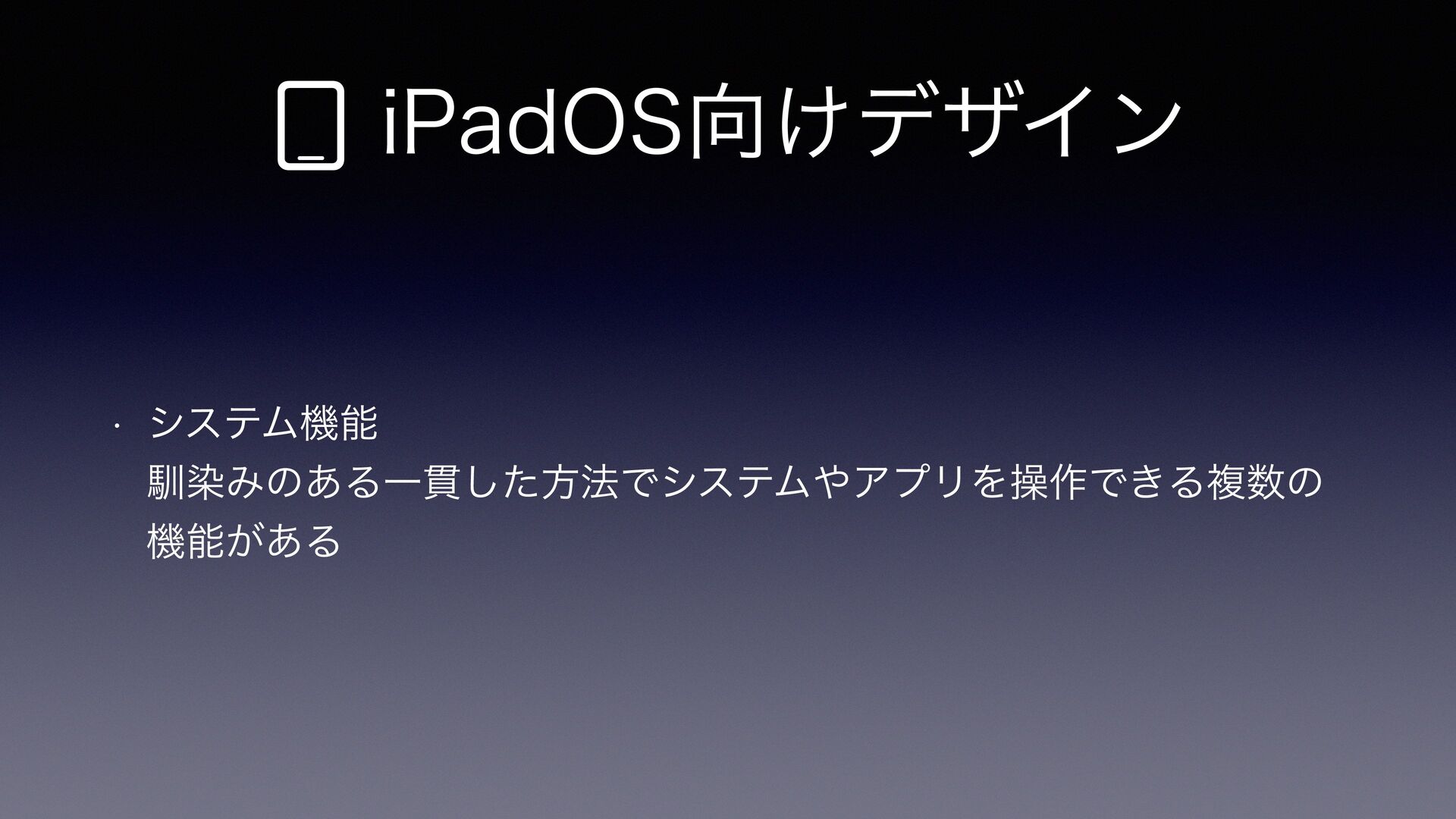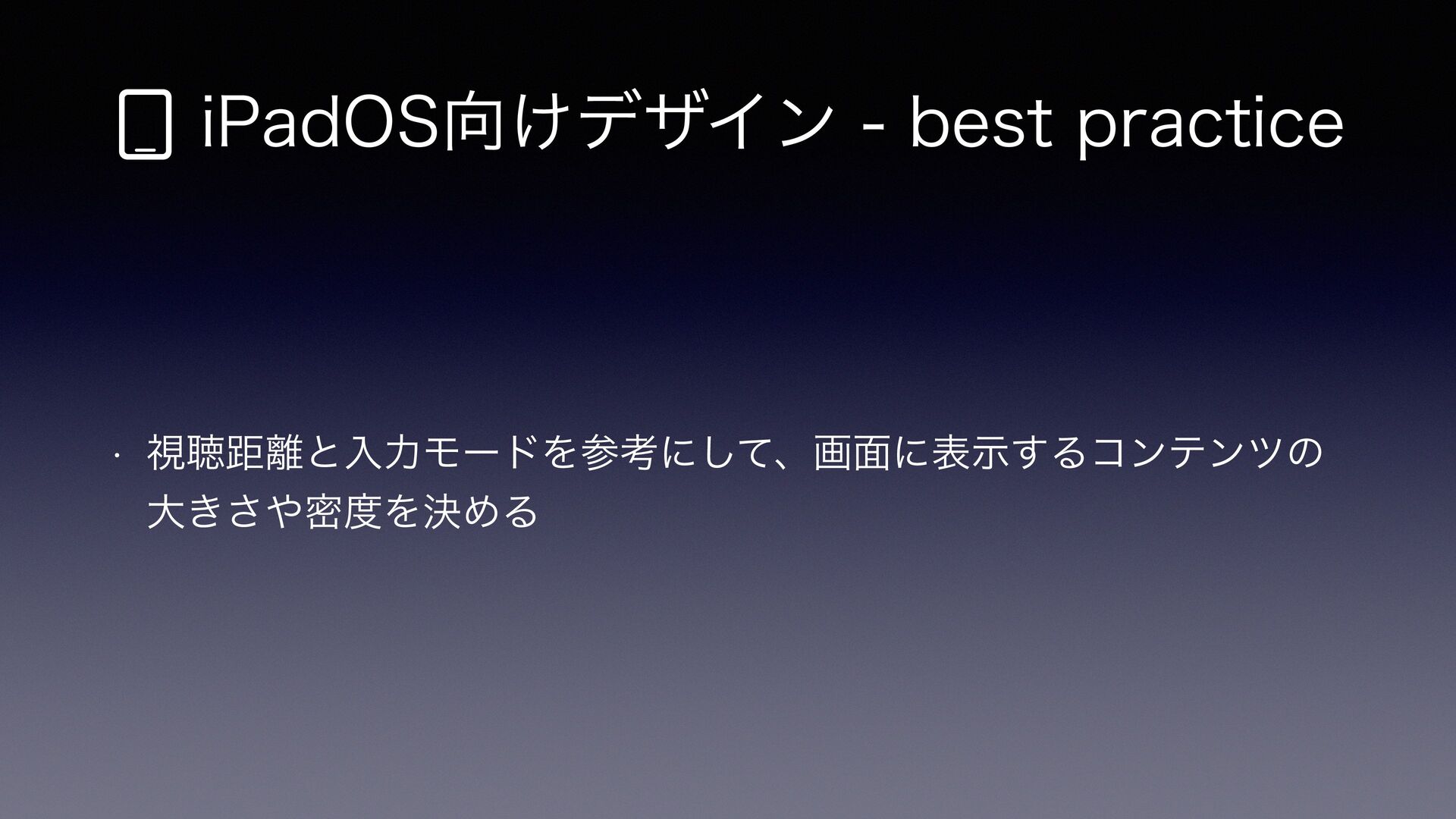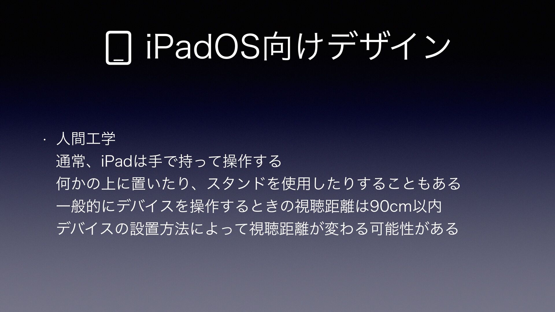 ΧϥʔϓϥοτϑΥʔϜͷߟྀࣄ߲ w J04J1BE04 TZTUFNͱHSPVQFEͷഎܠ৭͕͋ΓɺͦΕͧΕ͔࣍Β࣍·Ͱ༻ҙ ͞Ε͍ͯΔ ͜ΕʹΑΓɺ֊తʹใΛ͑Δ͜ͱ͕Ͱ͖Δ ࣍ɿશମͷϏϡʔͷഎܠ ࣍ɿશମͷϏϡʔͷதʹ͋Δίϯςϯπཁૉͷάϧʔϓͷഎܠ ࣍ɿ࣍ͷཁૉʹ͋Δίϯςϯπཁૉͷάϧʔϓͷഎܠ