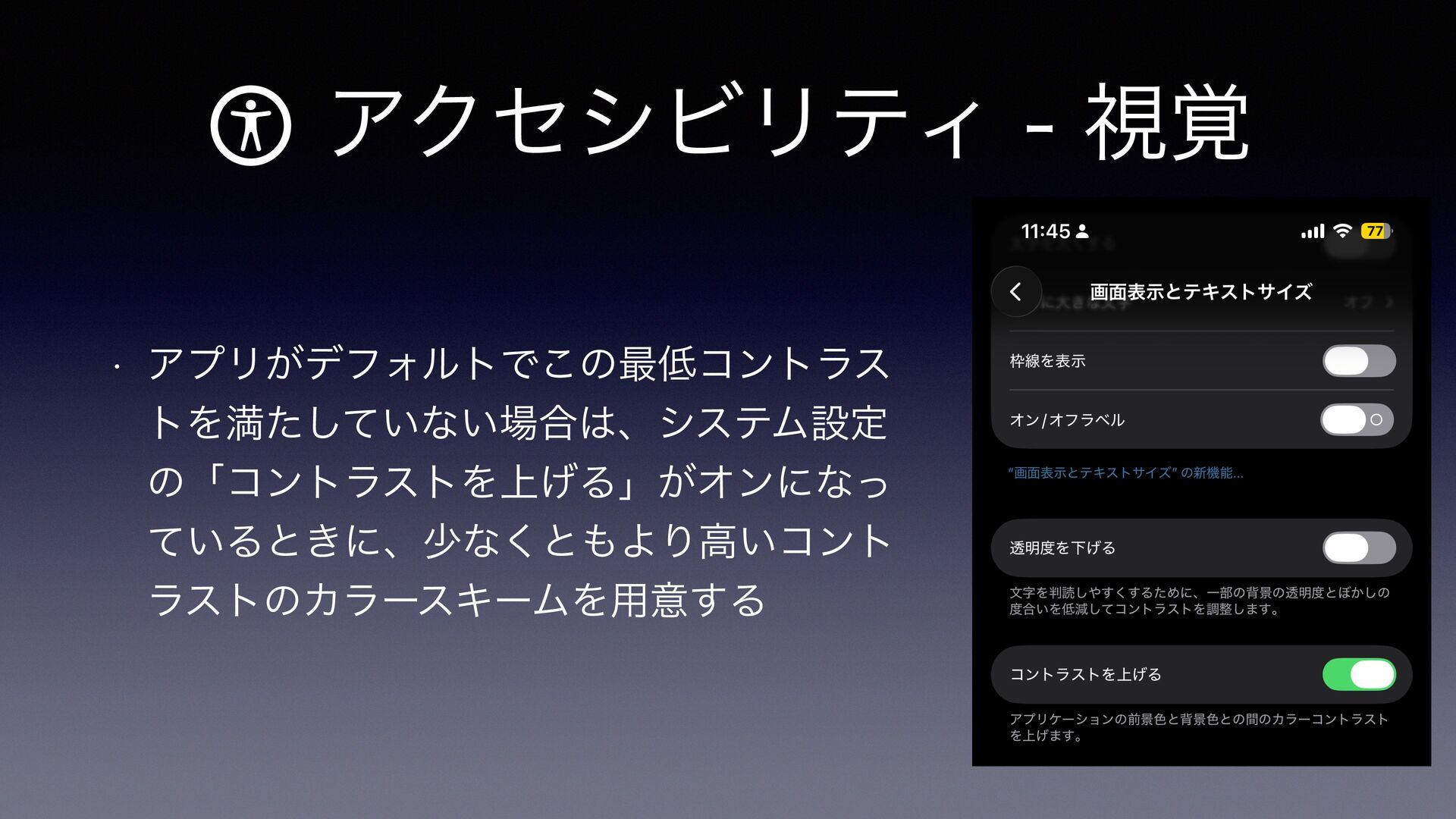 ΧϥʔϕετϓϥΫςΟε w ίϯςΩετ͕ϥΠτͰμʔΫͰΞϓϦͷΧϥʔ͕దʹදࣔ͞ΕΔ͜ͱΛ ֬ೝ͢Δ J04ɺJ1BE04ɺNBD04ɺ͓ΑͼUW04ͰɺϥΠτͱμʔΫͷ྆ํͷݟͨͷ ઃఆ͕༻ҙ͞Ε͍ͯΔ γεςϜΧϥʔɺγεςϜͷݟͨʹԠͯ͡ඍົʹมԽ͠ɺςΩετɺγϯϘ ϧɺͦͷଞͷཁૉͷ৭ͷҧ͍ͱίϯτϥετ͕దʹͳΔΑ͏ʹௐ͞ΕΔ ʮίϯτϥετΛ্͛ΔʯઃఆΛΦϯʹ͢Δͱɺ৭ͷҧ͍͕Δ͔ʹ໌֬ʹͳΔ