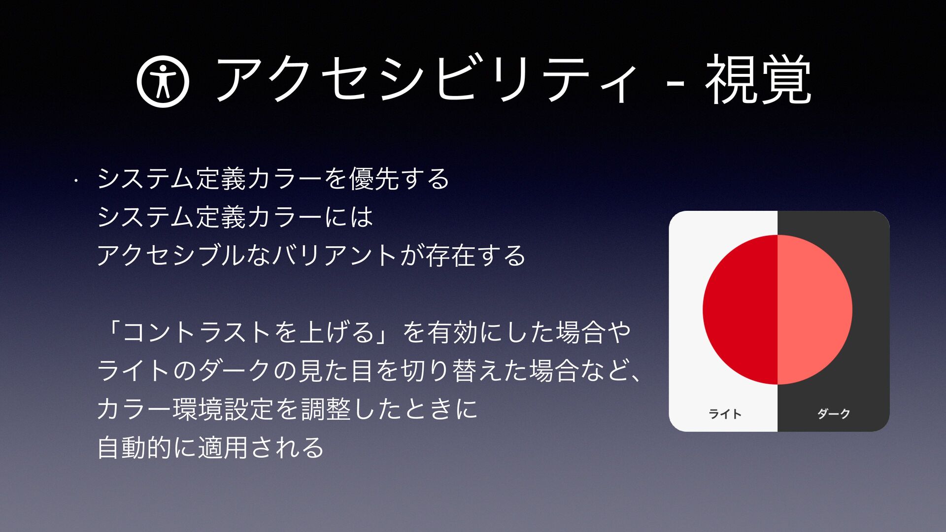 ΧϥʔγεςϜΧϥʔ w J04ɺJ1BE04ɺNBD04ɺWJTJPO04Ͱɺ Ұ࿈ͷμΠφϛοΫγεςϜΧϥʔఆٛ͞Ε͍ͯΔ μΠφϛοΫγεςϜΧϥʔɺඪ४6*ίϯϙʔωϯτͷΧϥʔεΩʔϜʹௐ ͠ɺϥΠτͱμʔΫͷ྆ํͷίϯςΩετʹࣗಈతʹదԠ͢Δ ͦΕͧΕͷμΠφϛοΫΧϥʔɺݟͨΧϥʔͷͰͳ͘ɺతʹԠͨ͡ҙ ຯͰఆٛ͞Ε͍ͯΔ ྫ͑ɺ͞·͟·ͳ֊ϨϕϧʹԠͨ͡ϏϡʔͷഎܠͷͨΊͷΧϥʔ͋Εɺ