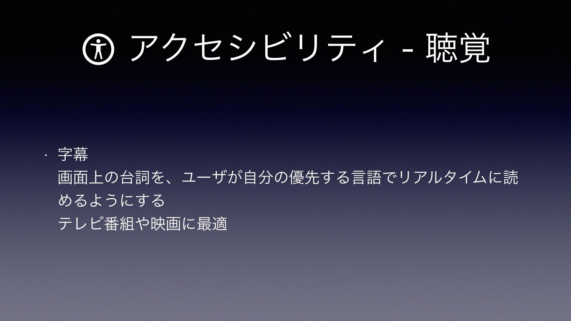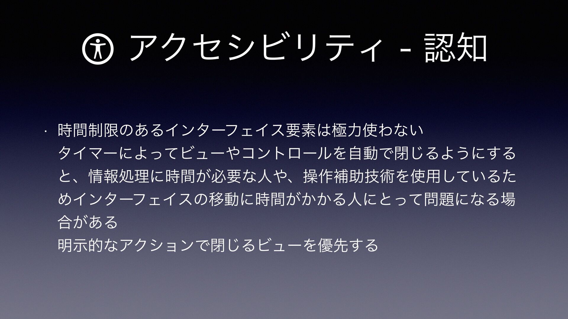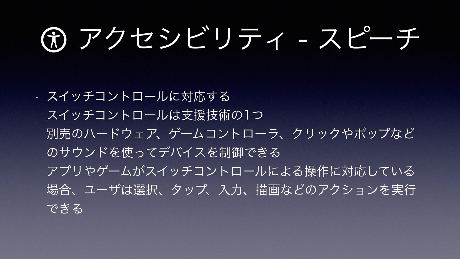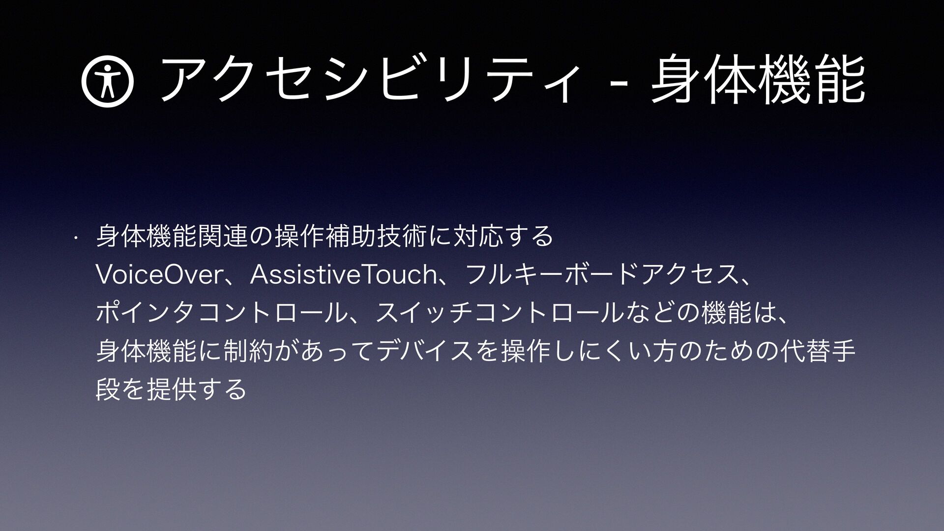 ΞΫηγϏϦςΟମػೳ w ମػೳؔ࿈ͷૢ࡞ิॿٕज़ʹରԠ͢Δ 7PJDF0WFSɺ"TTJTUJWF5PVDIɺϑϧΩʔϘʔυΞΫηεɺ ϙΠϯλίϯτϩʔϧɺεΠονίϯτϩʔϧͳͲͷػೳɺ ମػೳʹ੍͕͋ͬͯσόΠεΛૢ࡞͠ʹ͍͘ํͷͨΊͷସख ஈΛఏڙ͢Δ