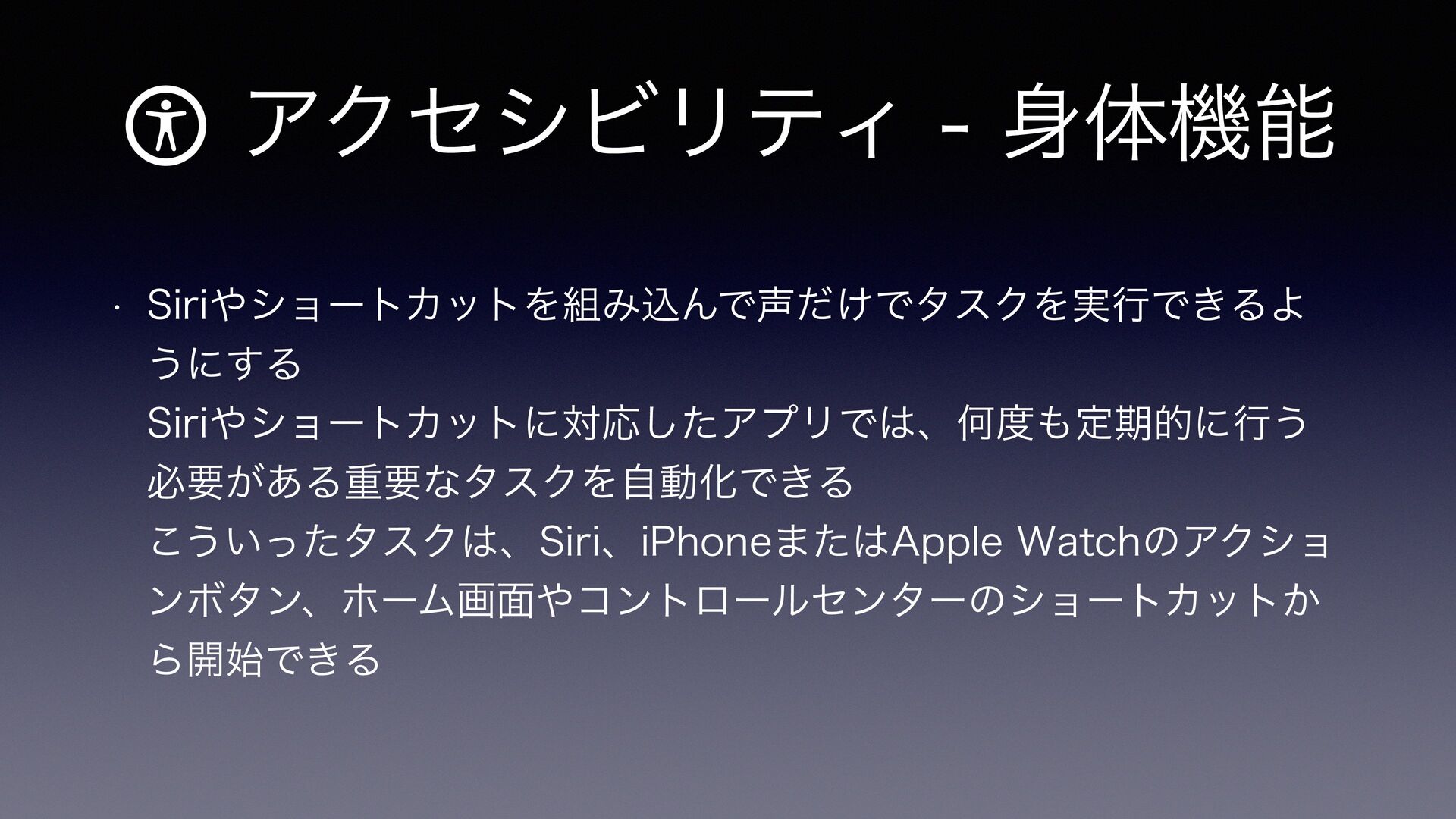 ΞΫηγϏϦςΟମػೳ w 4JSJγϣʔτΧοτΛΈࠐΜͰ͚ͩͰλεΫΛ࣮ߦͰ͖ΔΑ ͏ʹ͢Δ 4JSJγϣʔτΧοτʹରԠͨ͠ΞϓϦͰɺԿఆظతʹߦ͏ ඞཁ͕͋ΔॏཁͳλεΫΛࣗಈԽͰ͖Δ ͜͏͍ͬͨλεΫɺ4JSJɺJ1IPOF·ͨ"QQMF8BUDIͷΞΫγϣ ϯϘλϯɺϗʔϜը໘ίϯτϩʔϧηϯλʔͷγϣʔτΧοτ͔ Β։࢝Ͱ͖Δ
