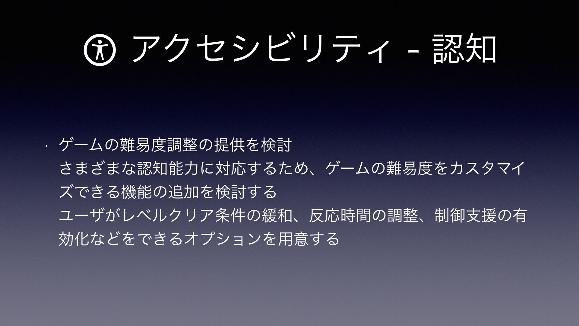 ΞΫηγϏϦςΟೝ w ήʔϜͷқௐͷఏڙΛݕ౼ ͞·͟·ͳೝೳྗʹରԠ͢ΔͨΊɺήʔϜͷқΛΧελϚΠ ζͰ͖ΔػೳͷՃΛݕ౼͢Δ Ϣʔβ͕ϨϕϧΫϦΞ݅ͷ؇ɺԠ࣌ؒͷௐɺ੍ޚࢧԉͷ༗ ޮԽͳͲΛͰ͖ΔΦϓγϣϯΛ༻ҙ͢Δ