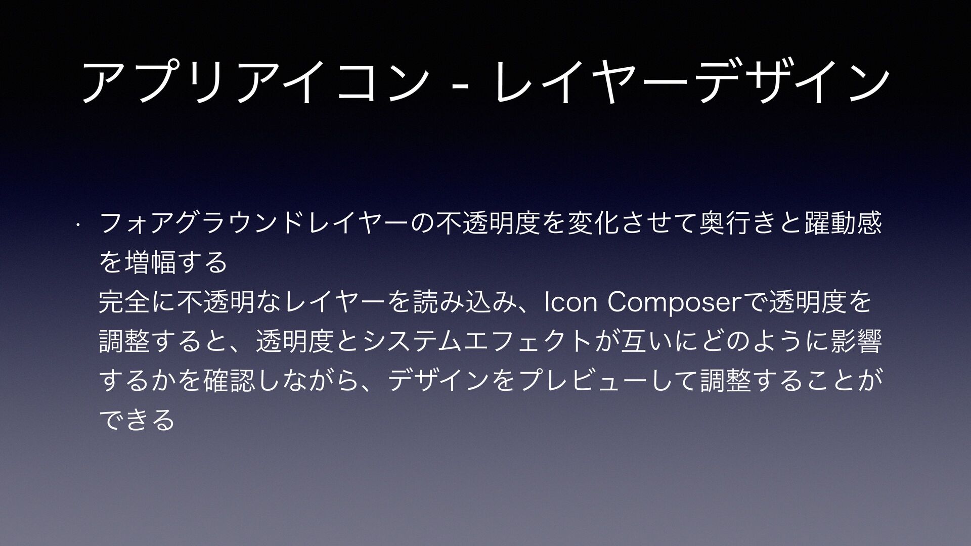 w ϑΥΞάϥϯυϨΠϠʔͷෆಁ໌ΛมԽͤͯ͞Ԟߦ͖ͱ༂ಈײ Λ૿෯͢Δ શʹෆಁ໌ͳϨΠϠʔΛಡΈࠐΈɺ*DPO$PNQPTFSͰಁ໌Λ ௐ͢Δͱɺಁ໌ͱγεςϜΤϑΣΫτ͕ޓ͍ʹͲͷΑ͏ʹӨڹ ͢Δ͔Λ֬ೝ͠ͳ͕ΒɺσβΠϯΛϓϨϏϡʔͯ͠ௐ͢Δ͜ͱ͕ Ͱ͖Δ ΞϓϦΞΠίϯϨΠϠʔσβΠϯ