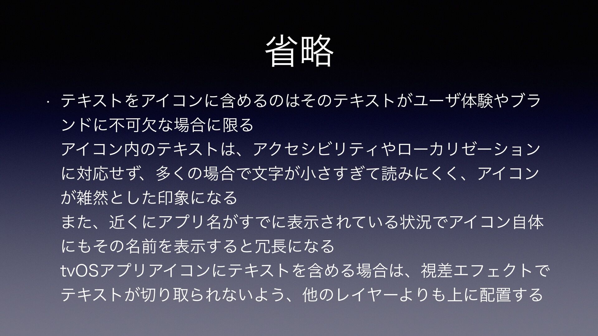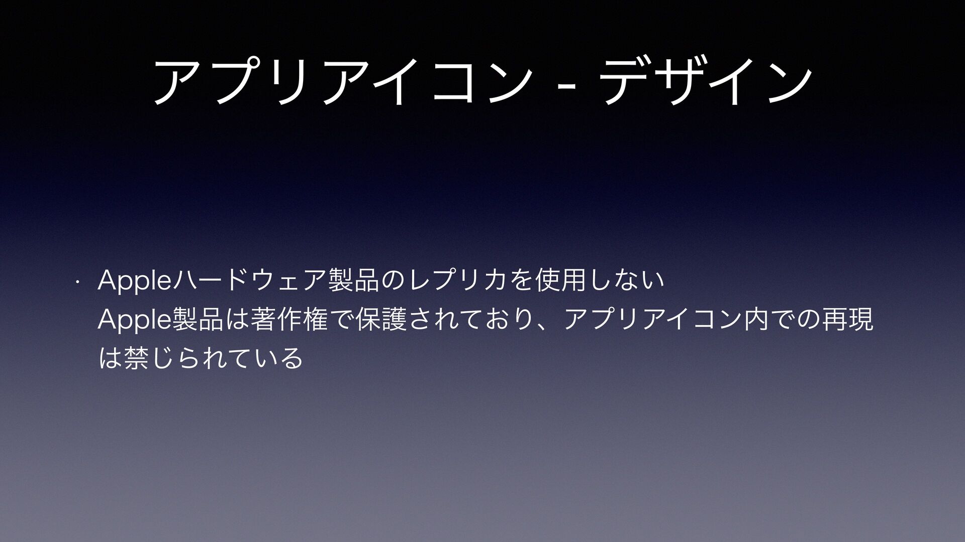 w ϓϥΠϚϦίϯςϯπΛதԝʹஔ͠ɺίʔφʔͷௐϚεΩϯ άͷద༻ͰΕͳ͍Α͏ʹ͢Δ w WJTJPO04͓ΑͼXBUDI04ͷΞΠίϯͰɺίϯςϯπΛதԝʹ ஔ͢ΔΑ͏ಛʹҙ͢Δ w ΞΠίϯͷஔʹɺ"QQMFσβΠϯϦιʔεͰఏڙ͞Ε͍ͯΔΞ ϓϦΞΠίϯ੍࡞༻ςϯϓϨʔτͷάϦουΛ༻͢Δ ΞϓϦΞΠίϯΞΠίϯͷܗঢ়