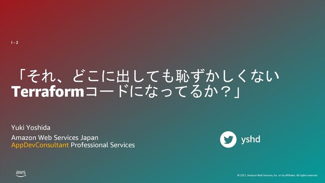 rights reserved. 「それ、どこに出しても恥ずかしくない Terraformコードになってるか?」 Yuki Yoshida Amazon Web Services Japan AppDevConsultant Professional Services I - 2