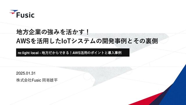 ©Fusic Co., Ltd. 0 地方企業の強みを活かす! AWSを活用したIoTシステムの開発事例とその裏側 2025.01.31 株式会社Fusic 岡嵜雄平 re:light