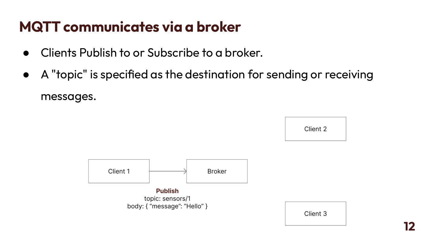 protocol designed for resource-constrained devices and low-bandwidth, high-latency, or unstable network environments. • Like HTTP, it is a protocol that sits on top of TCP. 11