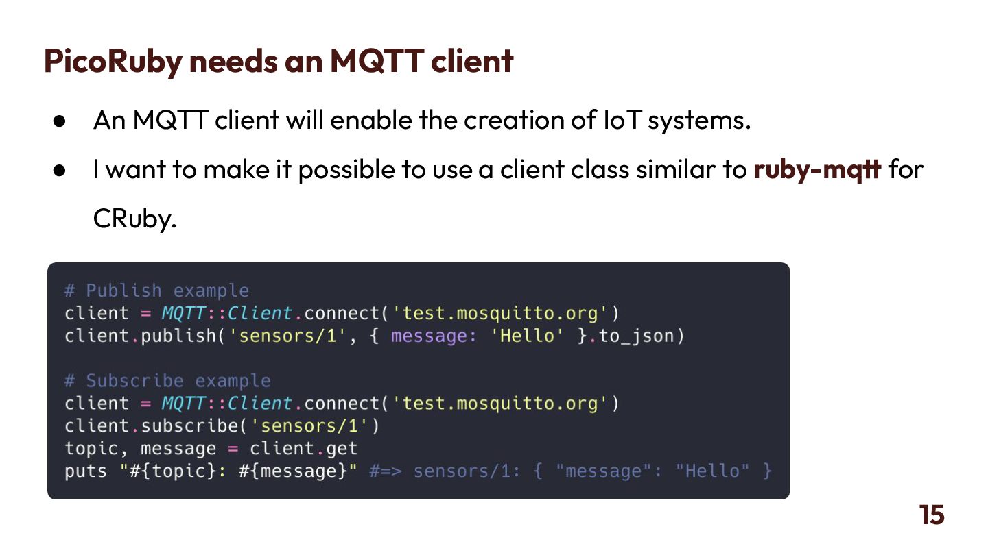 enable the creation of IoT systems. • I want to make it possible to use a client class similar to ruby-mqtt for CRuby. 15