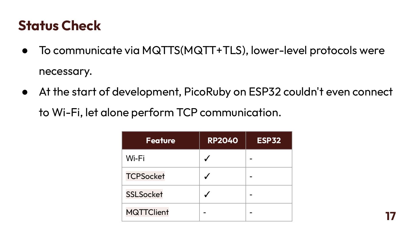 necessary. • At the start of development, PicoRuby on ESP32 couldn't even connect to Wi-Fi, let alone perform TCP communication. 17 Feature RP2040 ESP32 Wi-Fi ✓ - TCPSocket ✓ - SSLSocket ✓ - MQTTClient - -